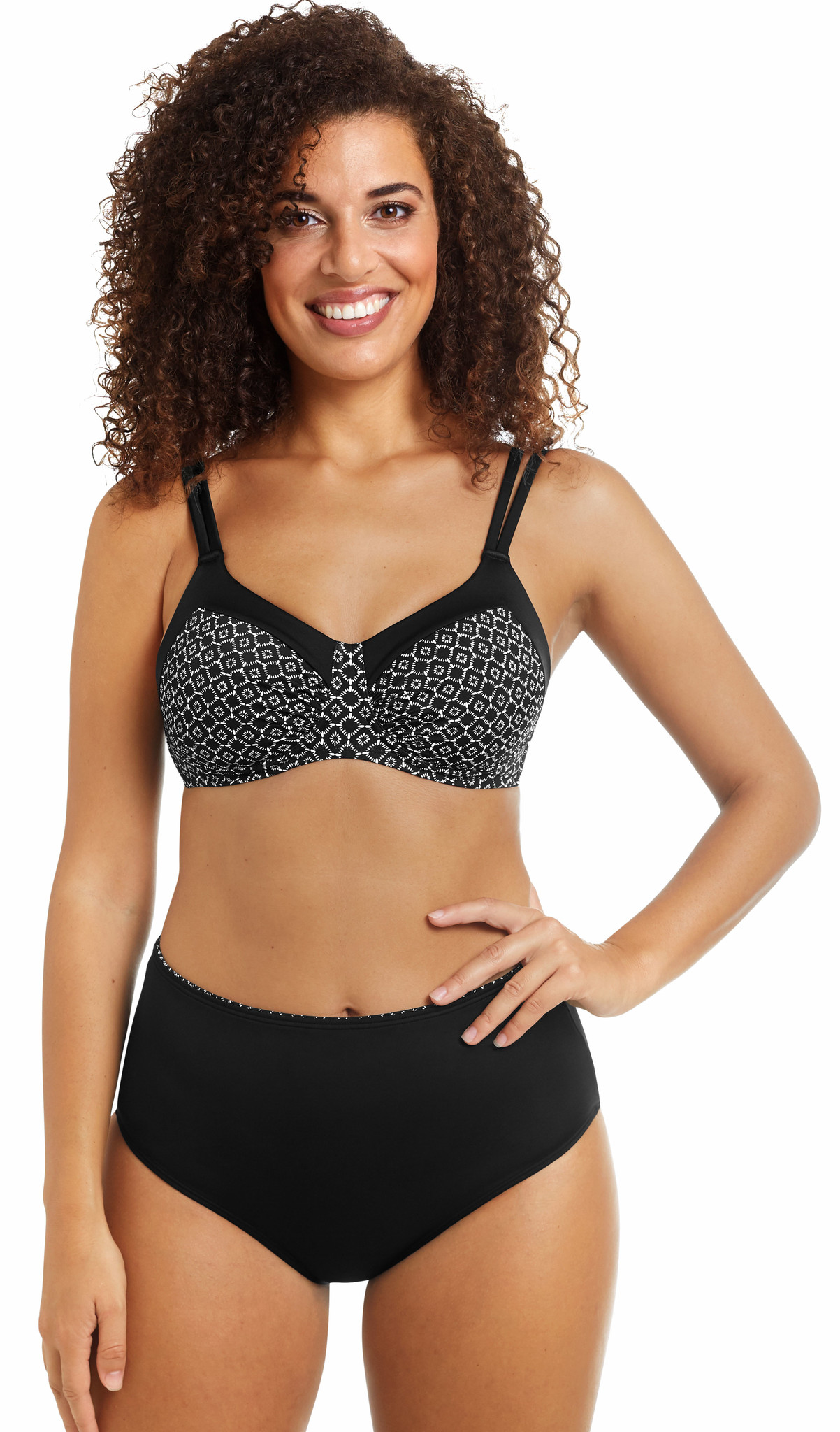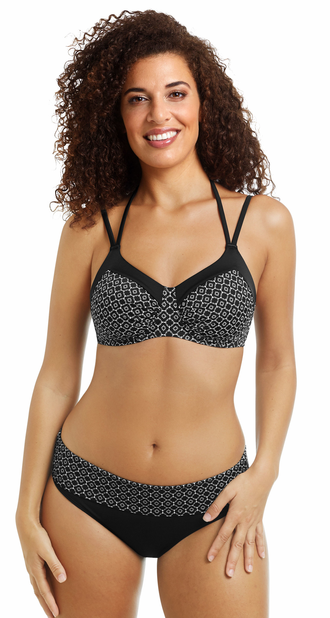 Uit Amoena Care collectie Ayon (prothese) bikinitop zonder beugel met licht ultra zachte voorgevormde cup de maat D36/D70,de basis kleur zwart gecombineerd met wit geometrisch printje.