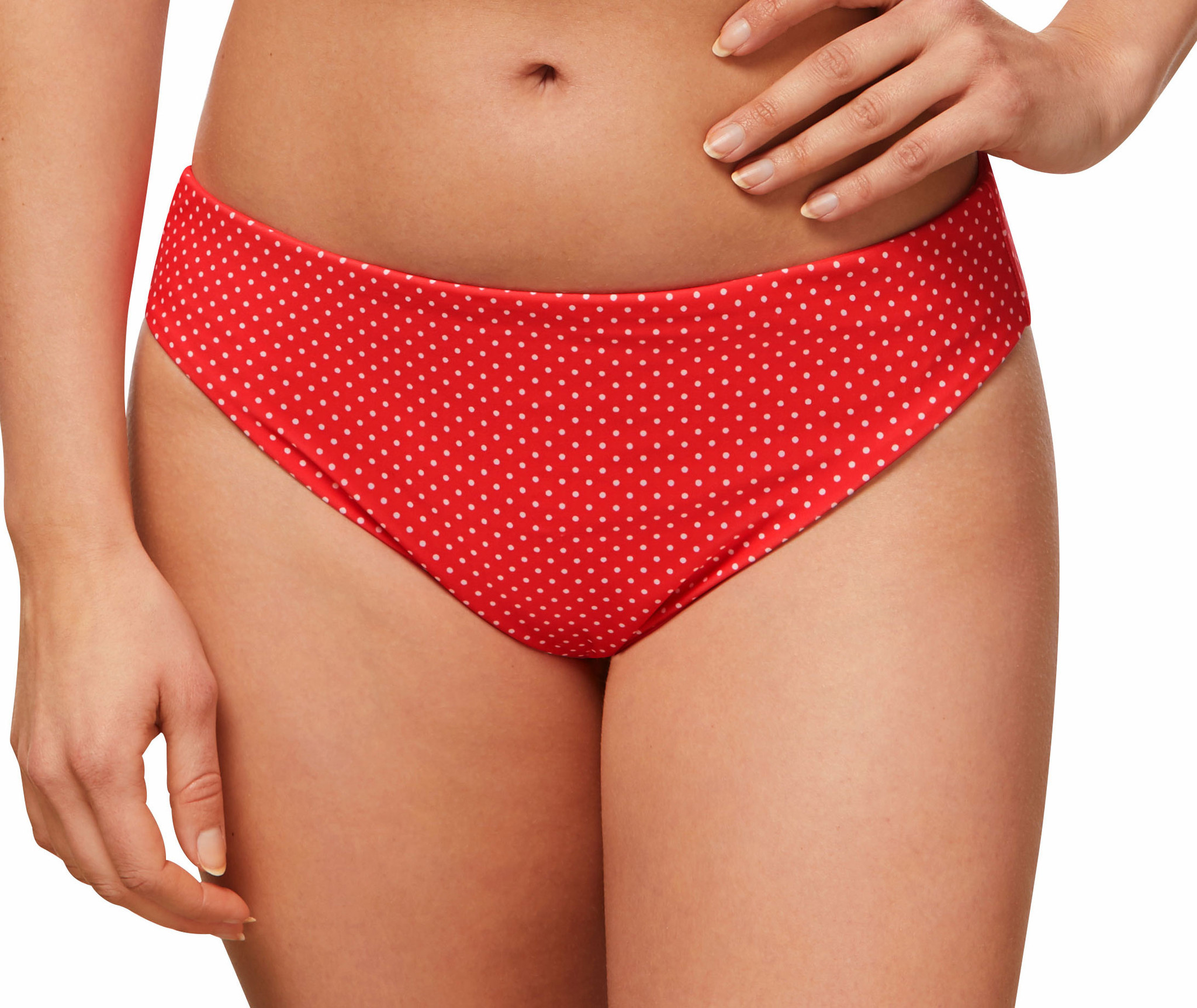Uit de Amoena badmode collectie de naadloze Romantic Down Town bikinislip nog leverbaar in de maat 46 kleur hibiscus met witte polkadots.