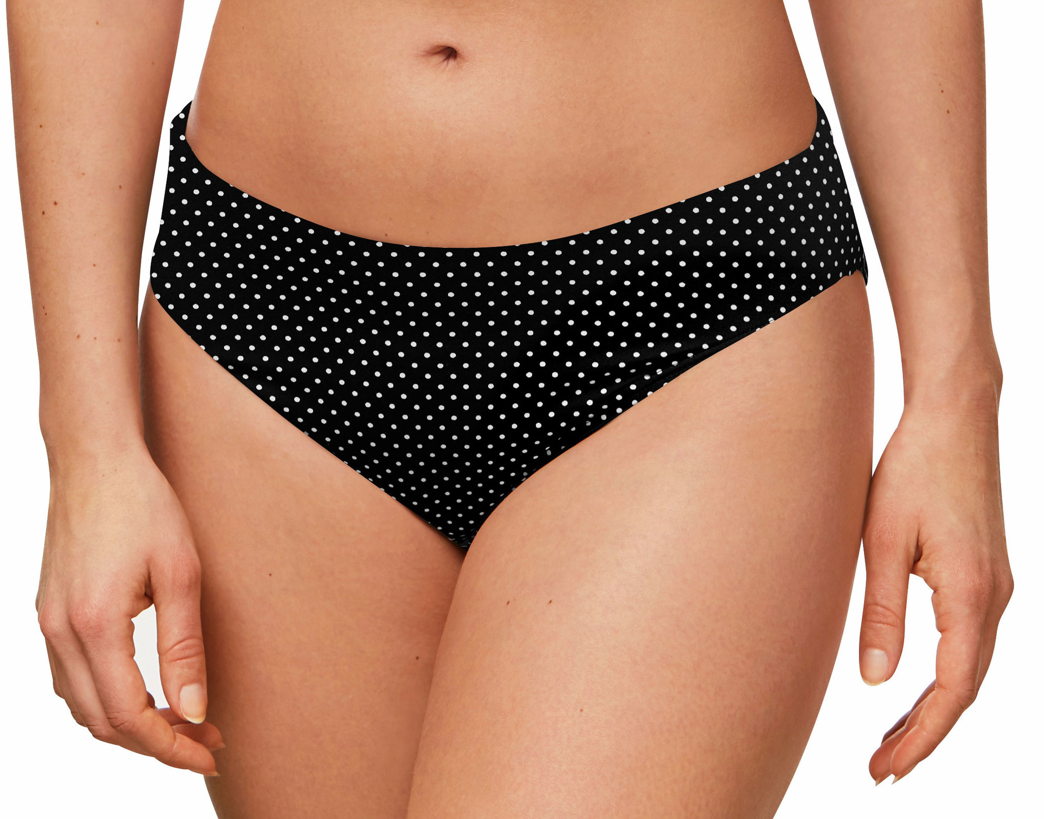 Uit de Amoena badmode collectie de naadloze Romantic Down Town bikinislip nog leverbaar in de maten 36 of 46, kleur zwart met witte polkadots.