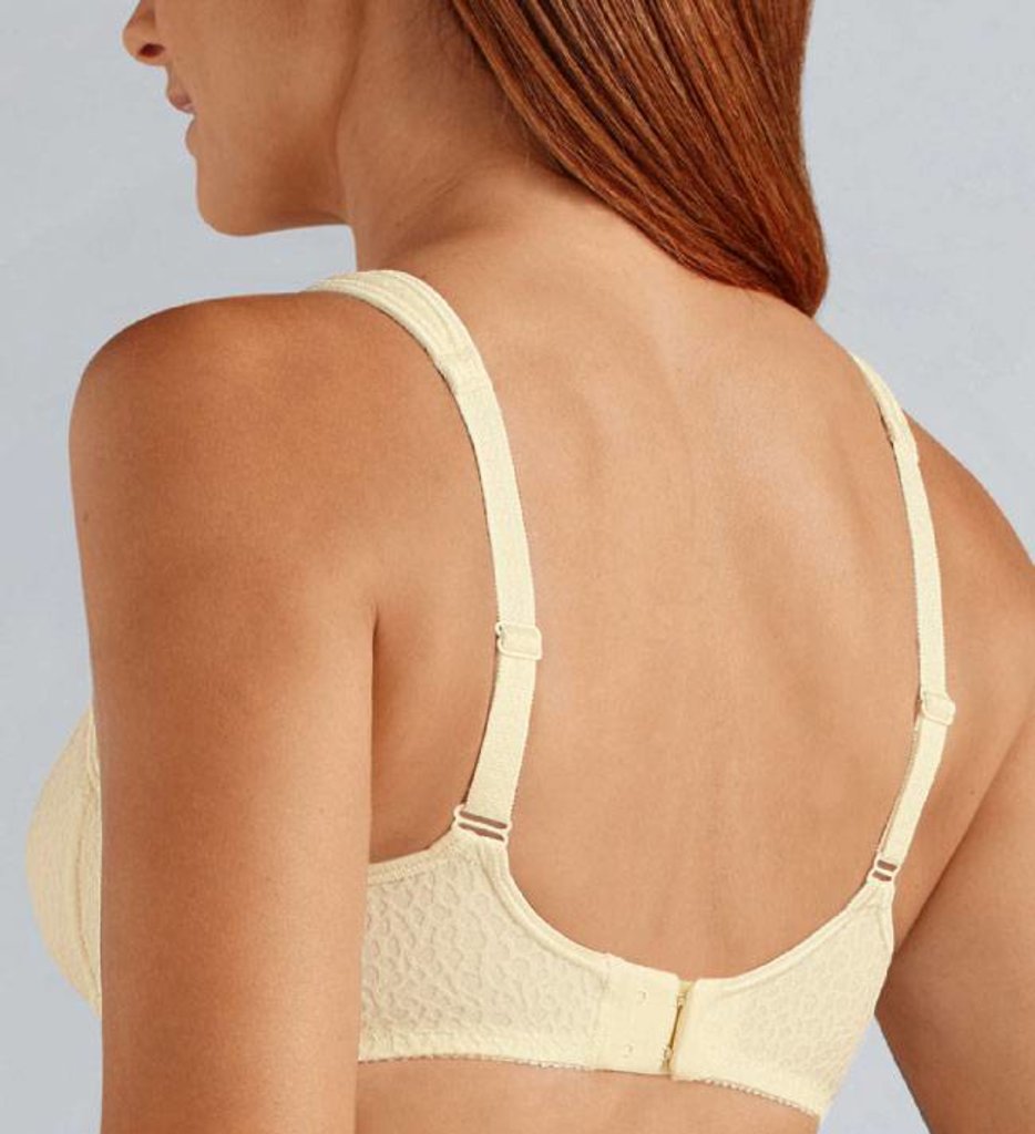 De stof heeft een subtiel ingeweven fantasie‑structuur die niet zichtbaar is onder strakke shirts. De cups zijn voorzien van een dubbele stoflaag voor extra stevigheid en een mooie, natuurlijke vorm. De comfort‑schouderbandjes zijn uitgerust met zachte luchtkussentjes die de druk op de schouders verminderen. Achter zijn de bandjes verstelbaar, zodat de bh altijd prettig aansluit.