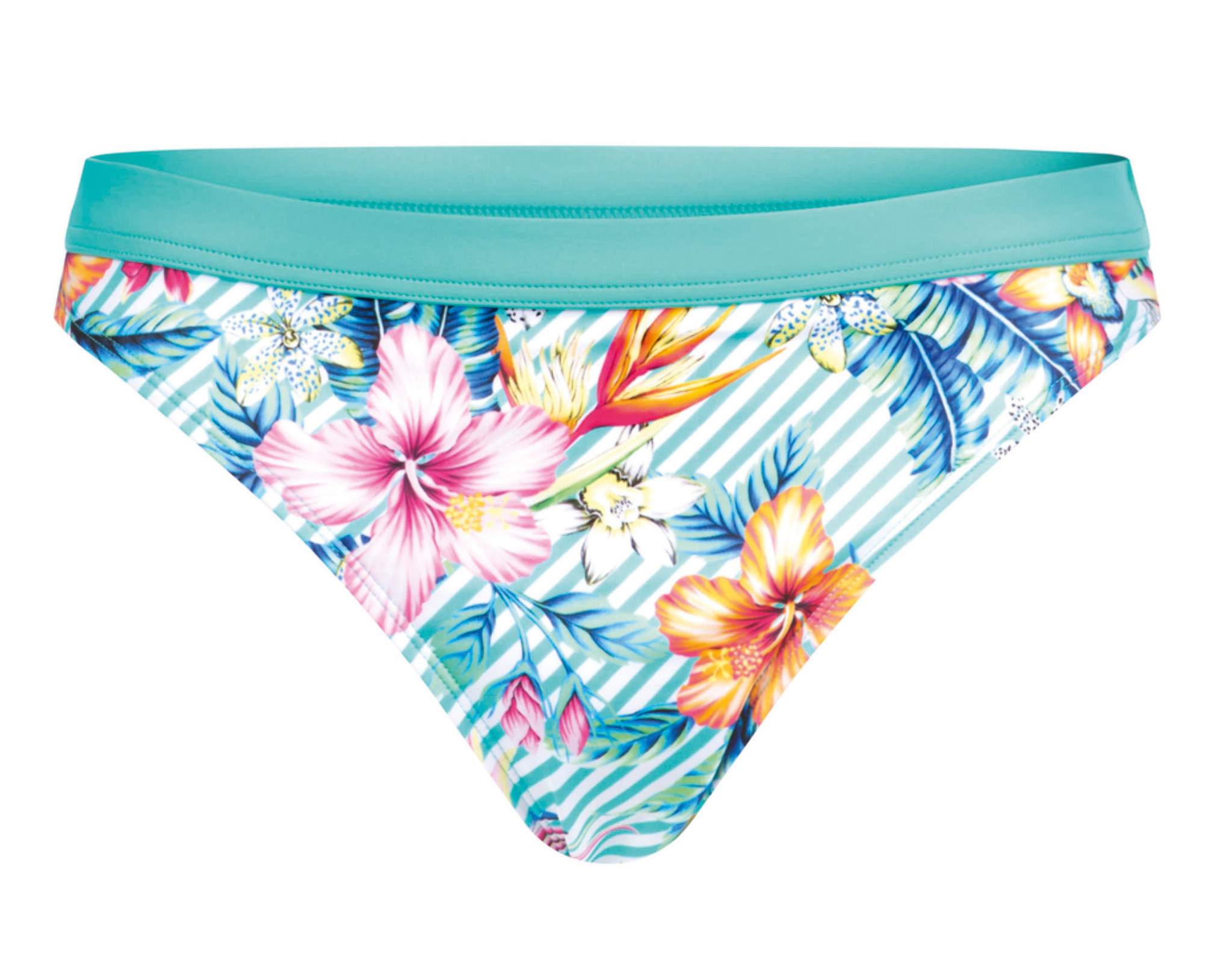 • Bikinislip aan voor & achterkant een zomerse bloemenprint, de elastisch tailleband aan bovenrand kleur turkoois.
