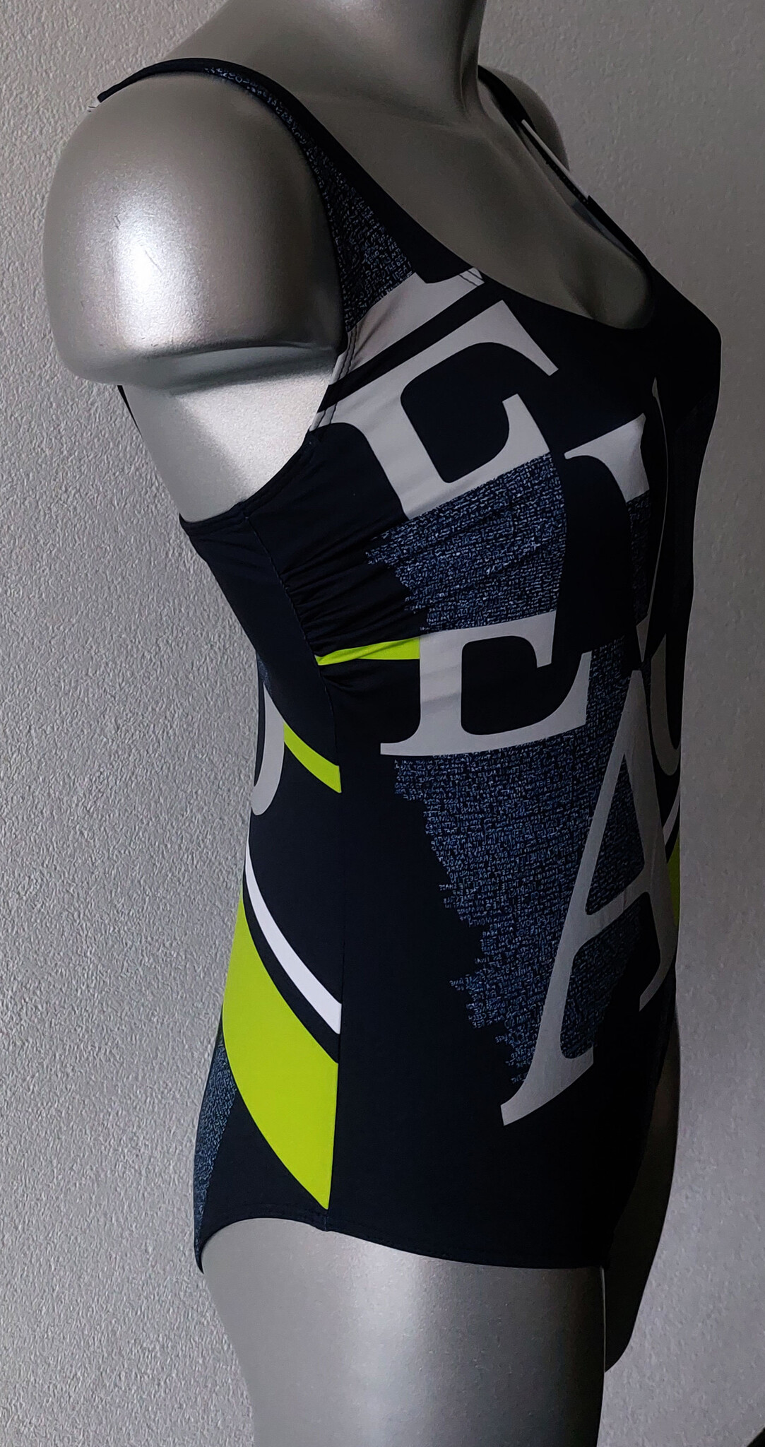 Uit de badmode collectie van Eva het badpak Djuna met ingewerkte beugel de kleur nachtblauw gecombineerd met print in de kleuren limegroen,wit & beige. De maten B38/B75 t/m D46/D95.