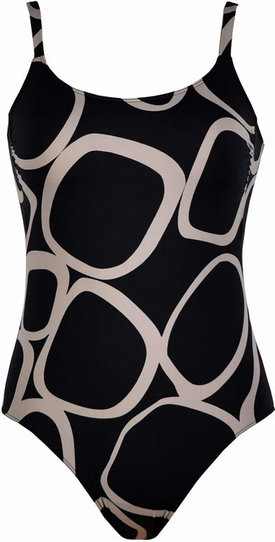 Uit de badmode collectie van Eva het badpak Amira zonder beugel & licht voorgevormde cup de maten B40=cupmt B80 t/m C44=cupmt C90, hoofdkleur antracietgrijs met print beige.