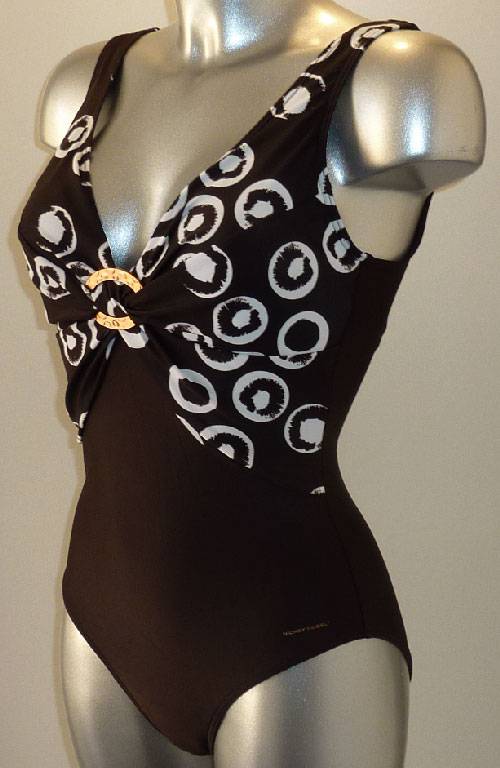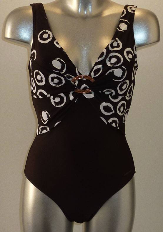 Uit de badmode collectie van Nickey Nobel dit modieuze badpak zonder beugel & licht voorgevormde cup in kleur bruin met print aan bovenkant. Nog leverbaar in de mt 38.