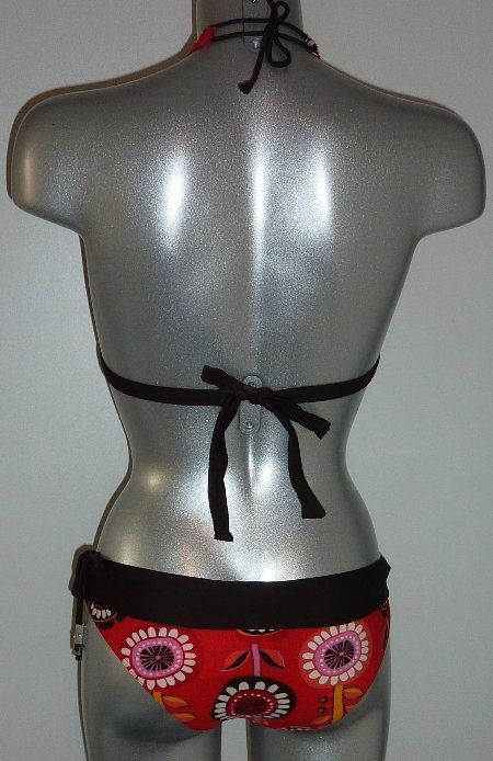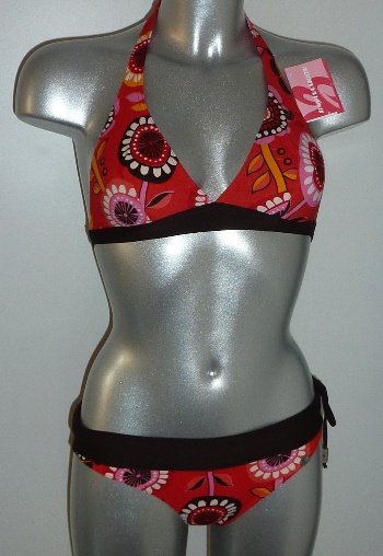 Uit de Banana Moon collectie de vrolijke sneldrogende halterbikini Canto-Fyrma Plucks met bijpassende heup bikinislip in de kleur rood met flower print & bies in het bruin nog leverbaar in de Franse maten 38 word euro mt 36 met cupmt B70, Franse mt 40 word een euro mt 38/cupmt B75 & de Franse mt 42 word een kleine euro mt 40 met cupmt B80.