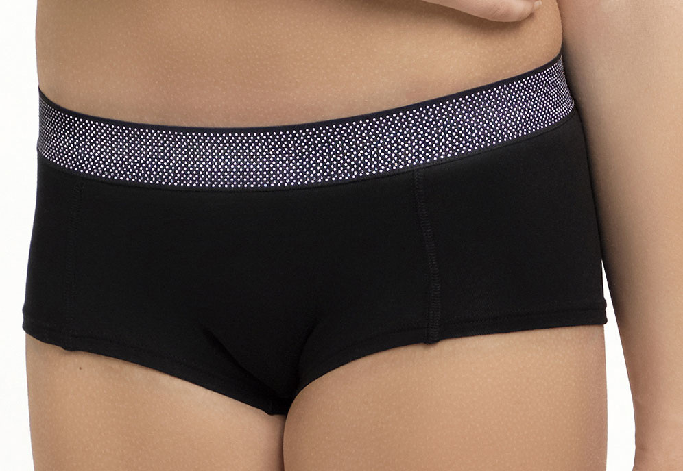 Uit basis collectie Boobs & Bloomers katoenen Audrey boxershort in zwart met elastische bies voorzien van klein wit stipje.De maten XXS is mt 140, mt XS is mt 152, mt S is mt 164, mt M is de mt 176 & mt L is confectie mt XS.