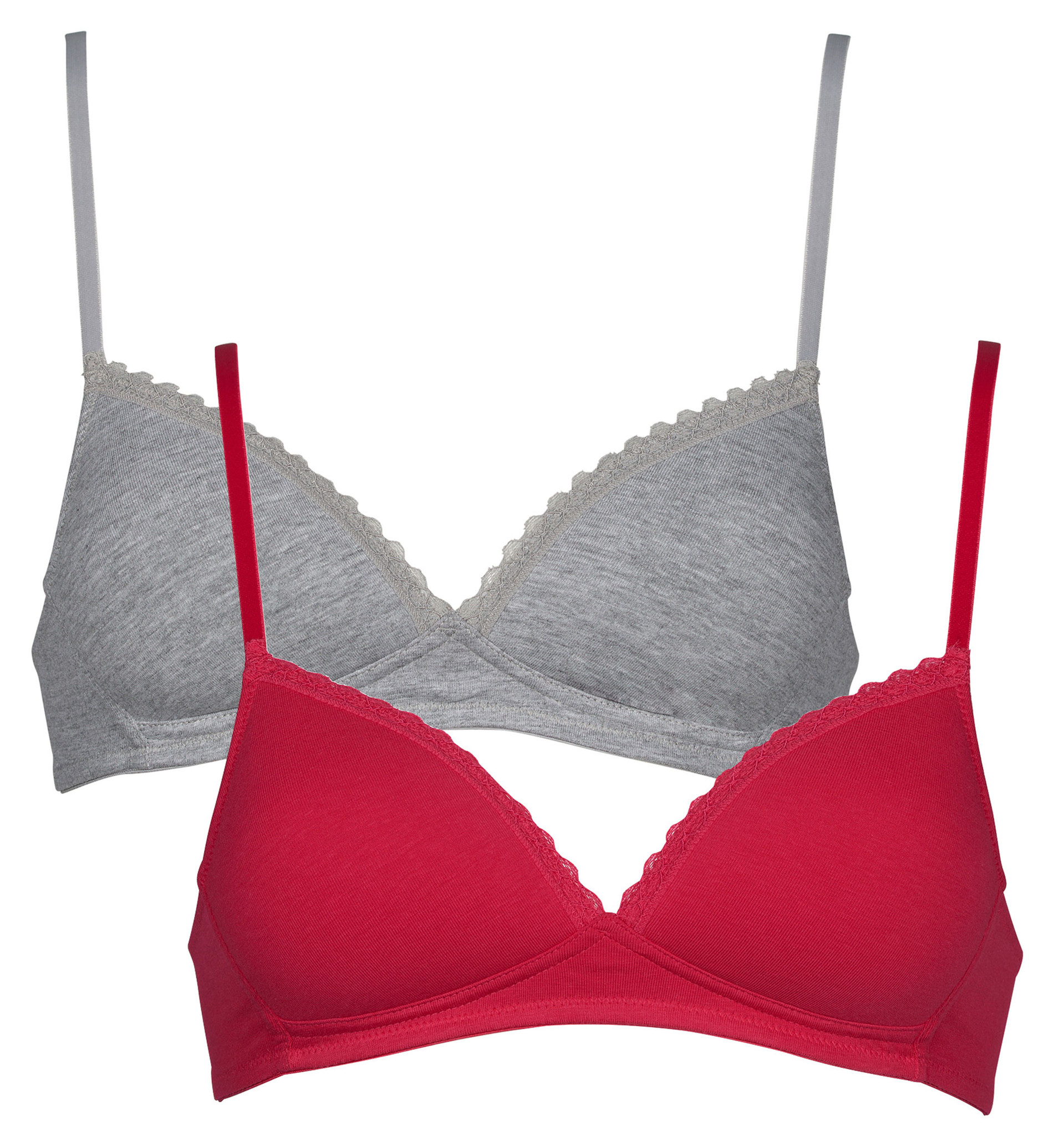 Uit Boobs & Bloomers my basic collectie een set van twee bh's zonder beugel & licht voorgevormde cups de maten AA65 t/m C85 in kleur pink en grijs melee.