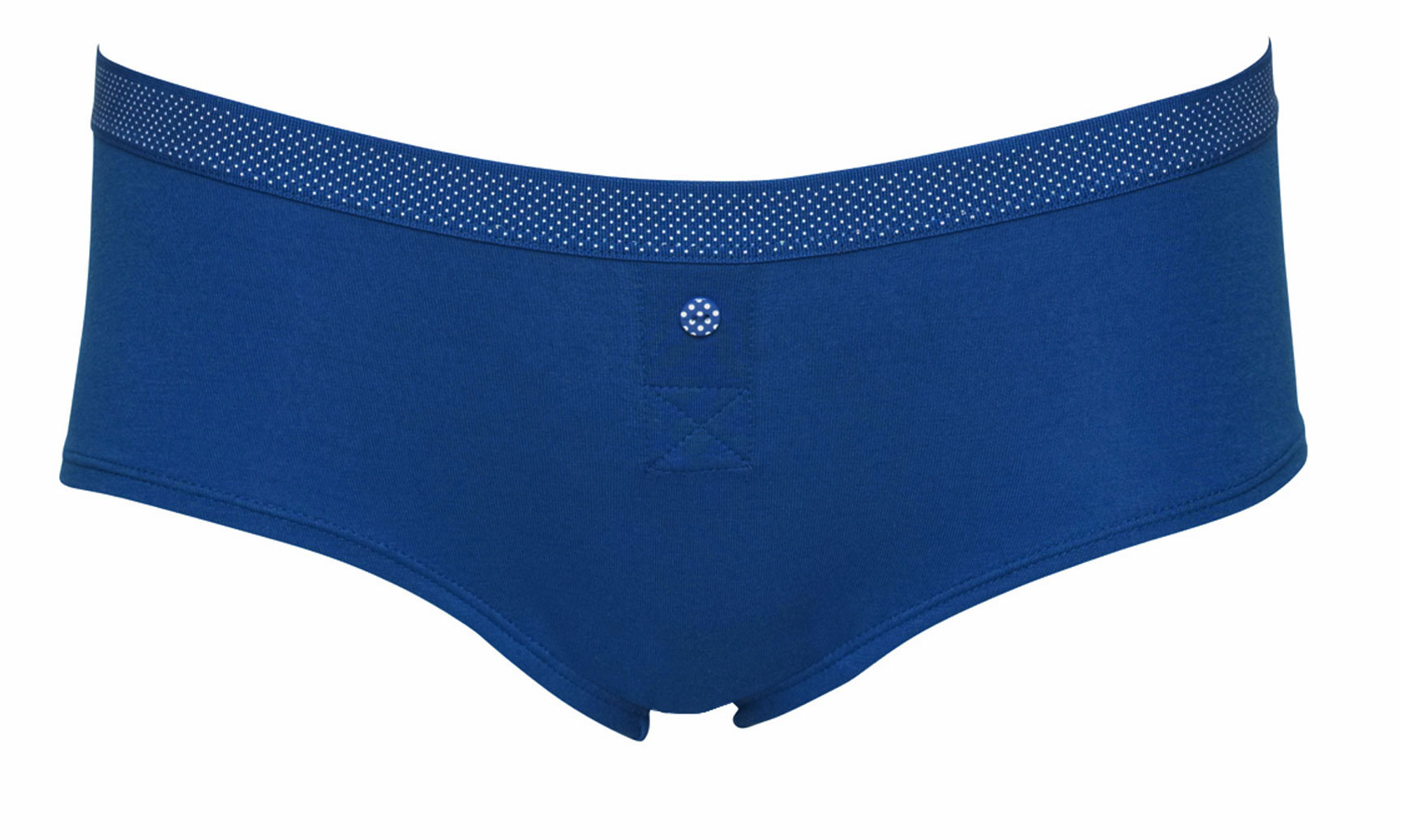 Van Boobs & Bloomers de serie Audrey. Katoenen heup boxershort in kleur kobaltblauw met elastische bies voorzien van klein wit stipje Sierknoopje aan voorkant. Maat 152 .