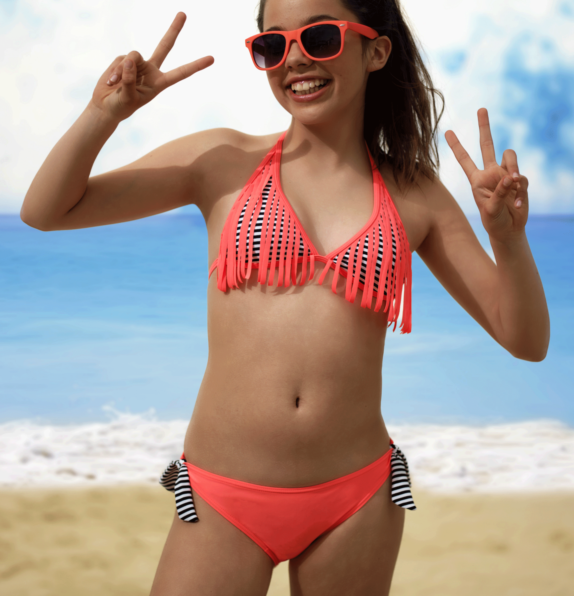 Uit de Boobs & Bloomers Beach collectie de Lynn triangle bikinitop zonder beugel & lichte uitneembare padding kleur wit met zwart gestreept & fringes kleur corail gecombineerd met bijpassende bikinislip kleur corail. Leverbaar in de maat 152. (bikini valt iets kleiner uit de mt 152 is te vergelijken met een maat 140/146).
