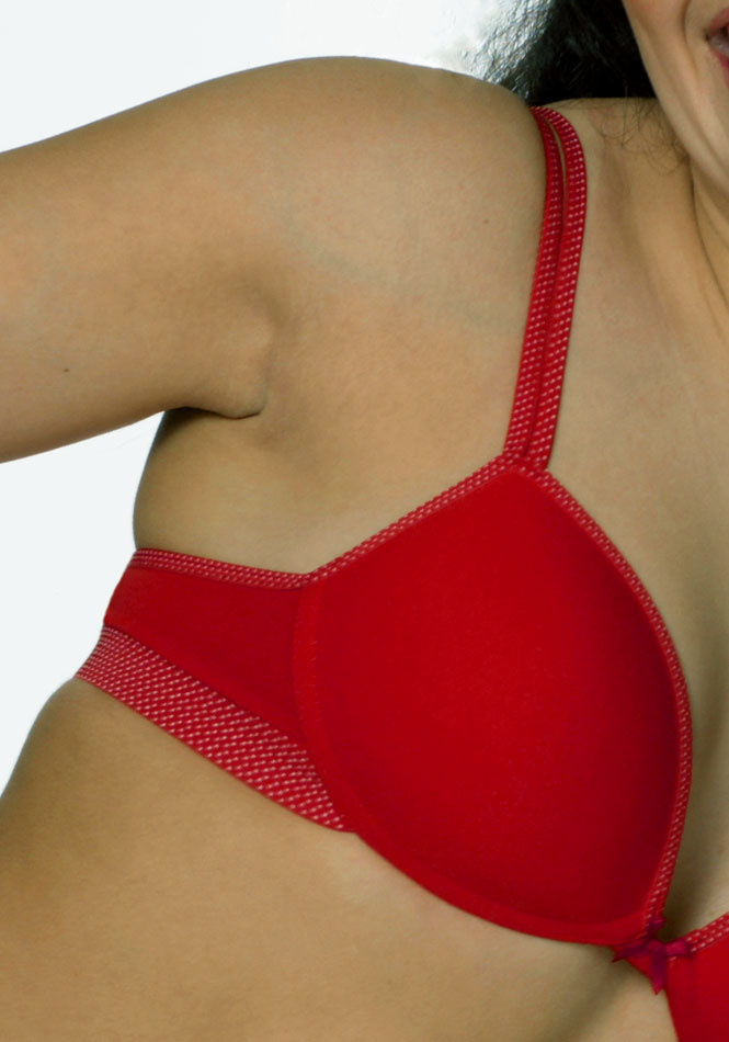 Uit Boobs & Bloomers collectie de katoenen Bh Anny, zonder beugel & licht voorgevormde cup.Leverbaar in de maten A80, mt B65 of mt B70 kleur bright red met klein stipprintje kleur grijs.
