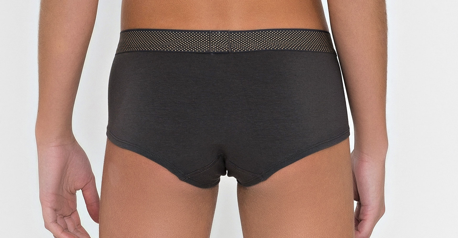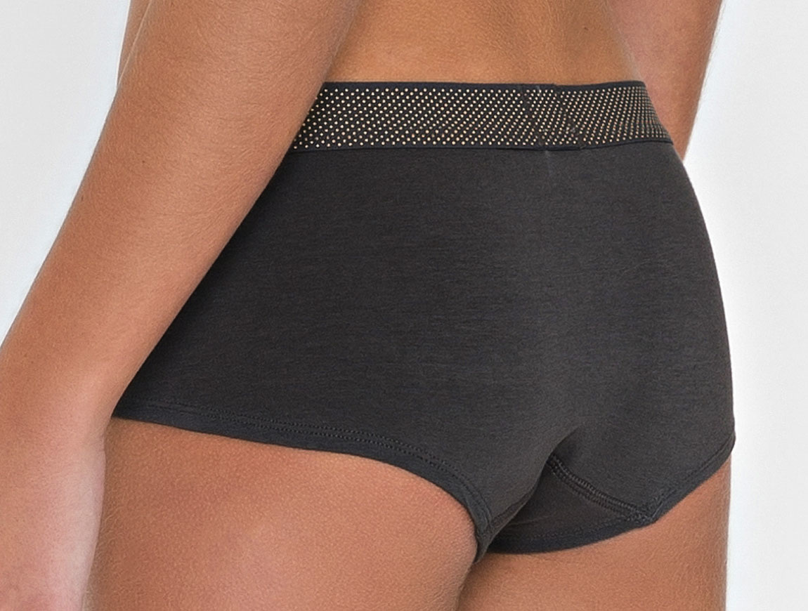 Uit de Boobs & Bloomers collectie de Anny katoenen boxershort de kleur grijs met beige stip printje. Leverbaar in de maten XXS is mt 140/146 of mt XS is de mt 152/158.