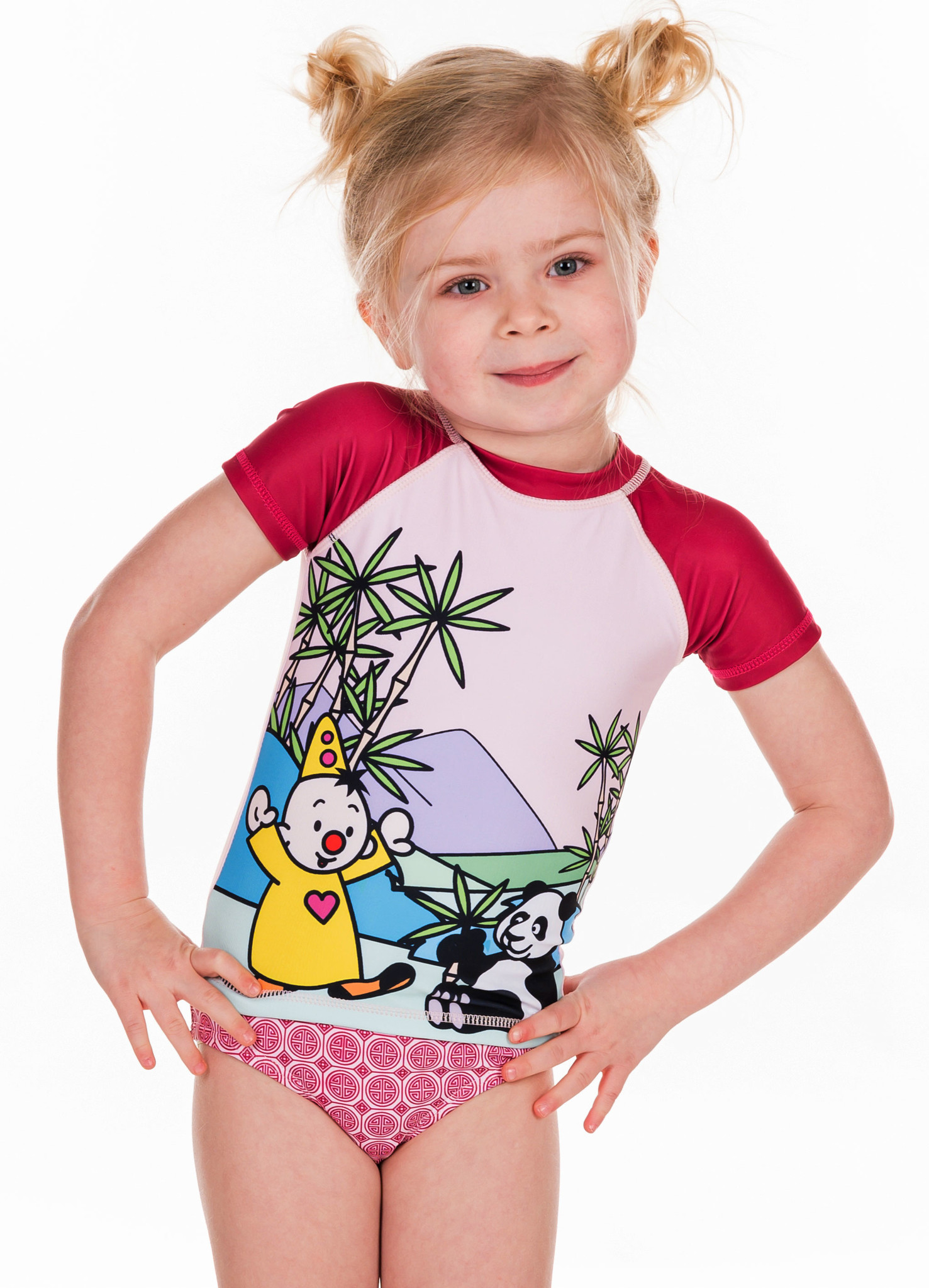 Schattig Bumba zwemsetje voor de jonge dames onder ons een microfaser shirtje met afbeelding van clowntje Bumba & pandabeer gecombineerd met bikinibroekje. De maten 86/92 word 74/80 of 98/104 word 86/92.