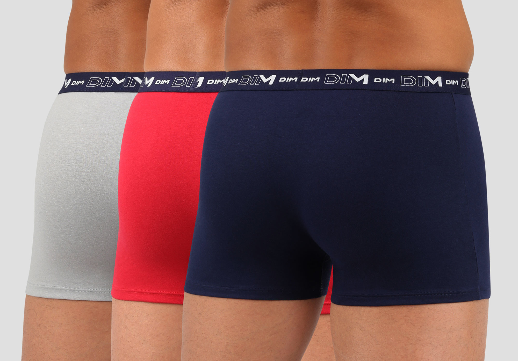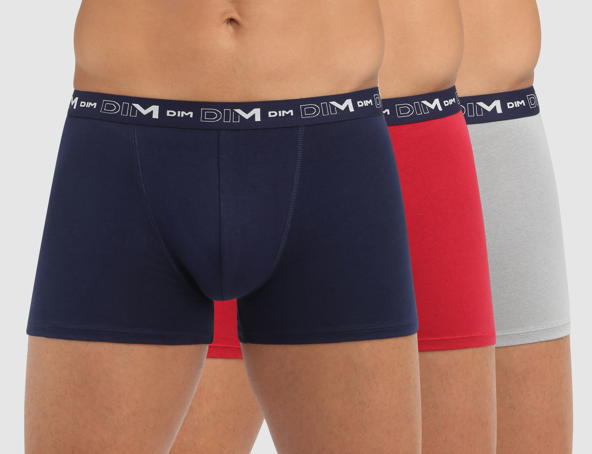 Uit de Dim heren collectie het drie delige cotton stretch boxershortset de maten M t/m XXL de kleurencombinatie rood, marineblauw & grijs.