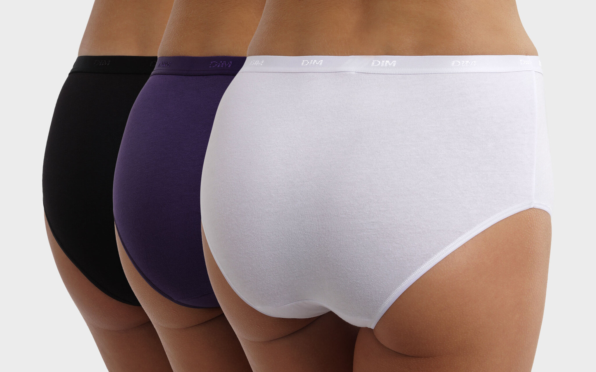 Uit de basis collectie van Dim een drie delig coton stretch boxershort set in de basis tinten zwart,wit & aubergine. De maten 34/36-S t/m 42/44-L.