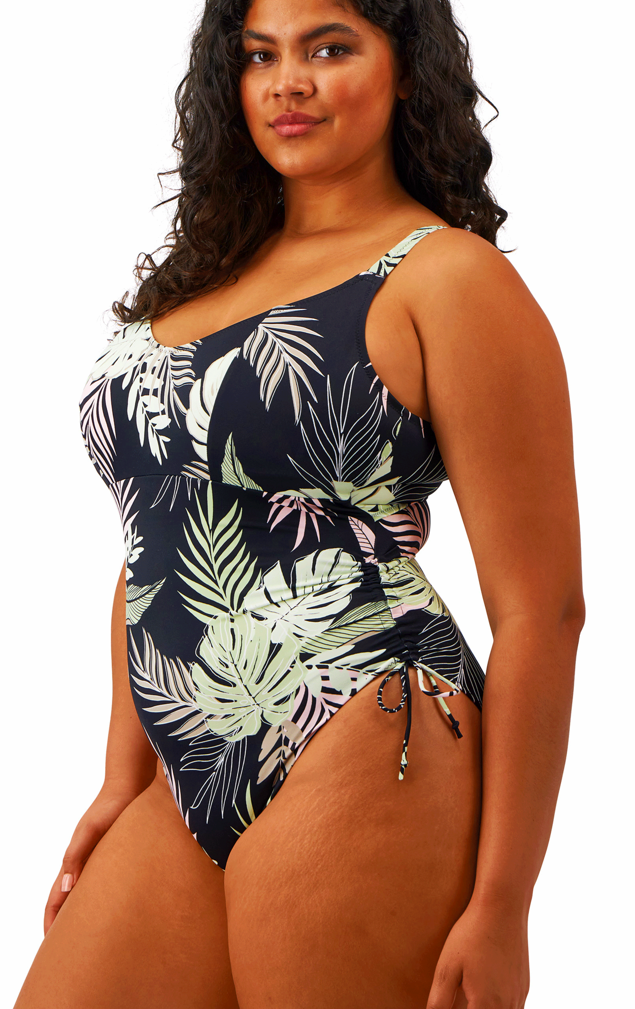 Elomi Tropical Retreat licht gewicht badpak zonder beugel, de kleur zwart gecombineerd met jungle blad in groen & roze tinten, de maten 80 G/H t/m 95 G/H.