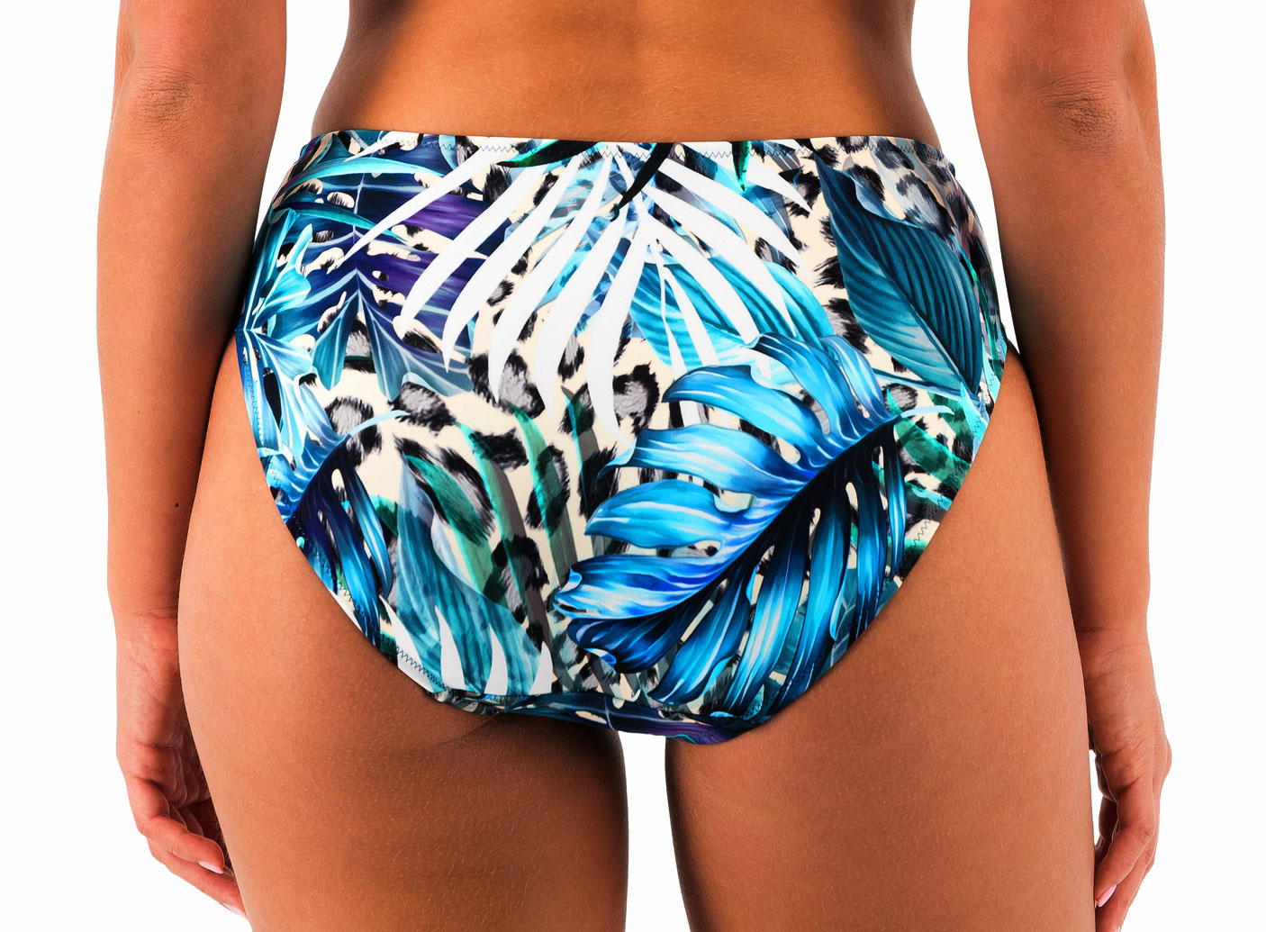 Uit de badmode collectie van Fantasie de Kabini Oasis bikinislip met hoge taille, kleur aquablauw met print jungle blad, gecombineerd met snow panther print. De maat 40-M, nog leverbaar.