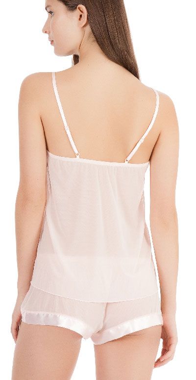 • Bijpassende los vallende boxershort aan voor & achterzijde gemaakt van zachte licht transparante chiffon, aan bovenkant een elastisch tailleband & aan de beenuitsnijding afgebiest met satijn.