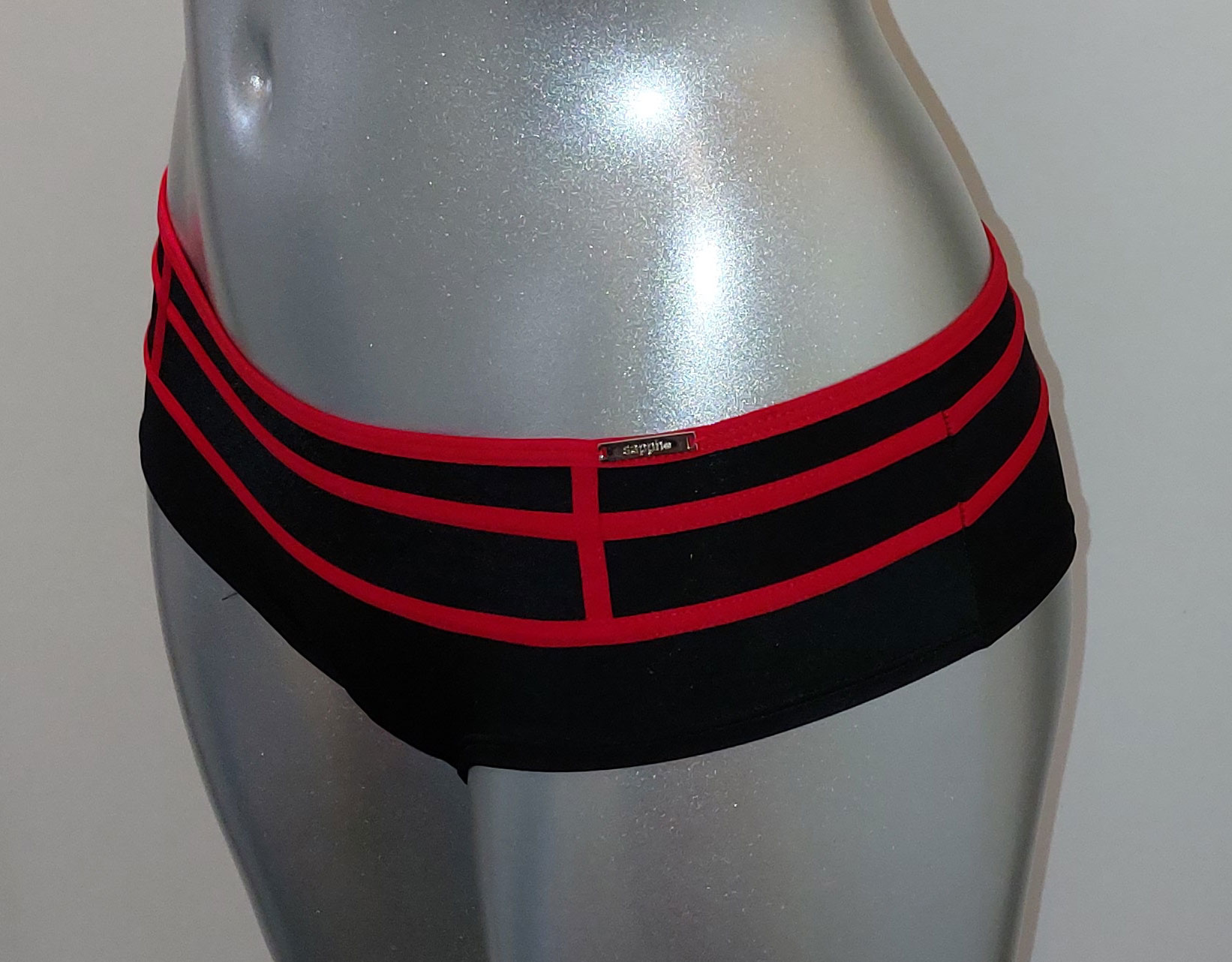 Uit de Sale collectie van Sapph de microfaser Twist heupboxer kleur zwart met rode bies of rood met een zwarte bies nog leverbaar in de mt S.