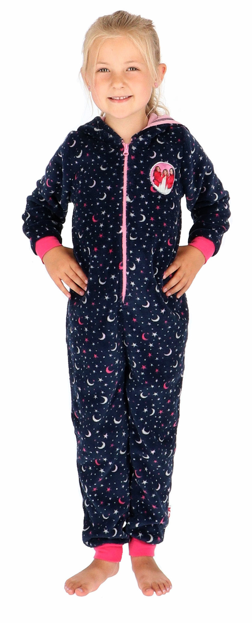 Nieuw uit de winter collectie van Studio 100, de onesie van K3 gemaakt van zachte coral fleecestof, de kleur antracietgrijs met print sterren & maan, de maat 134/140.