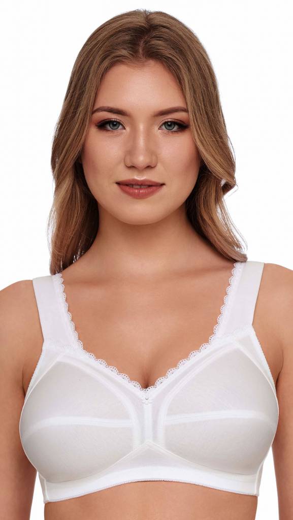 Uit de Susa Topsy plus collectie de stevige Faja Bh zonder beugel gemaakt van 100% katoen. Leverbaar in basis kleur wit mt A75 t/m D110 of cappuccino kleur mt B80.