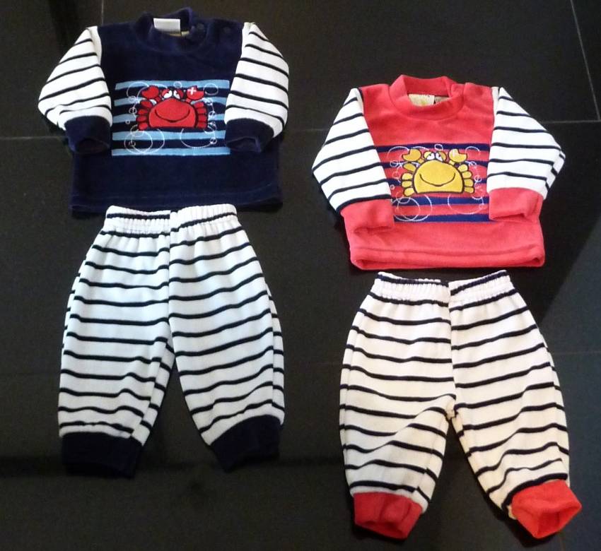 Het jasje is uitgevoerd in rood met kreeft‑afbeelding of in marineblauw met kreeft‑print. De broekjes zijn mooi afgestemd: kies voor een rood/witte streepprint of een marineblauw/witte streepprint.