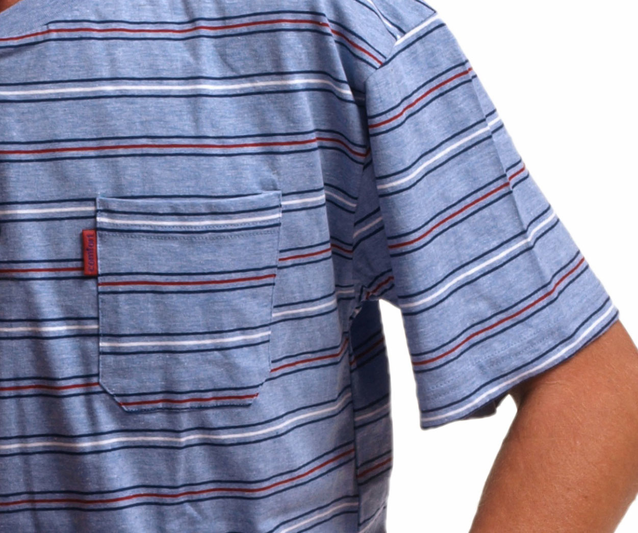 • Het Shirt in kleur blauw mêlee met streepprint de kleuren rood, wit & marineblauw,met polosluiting, ronde hals & borstzakje in een zachte katoen die in breedte richting licht meerekt.