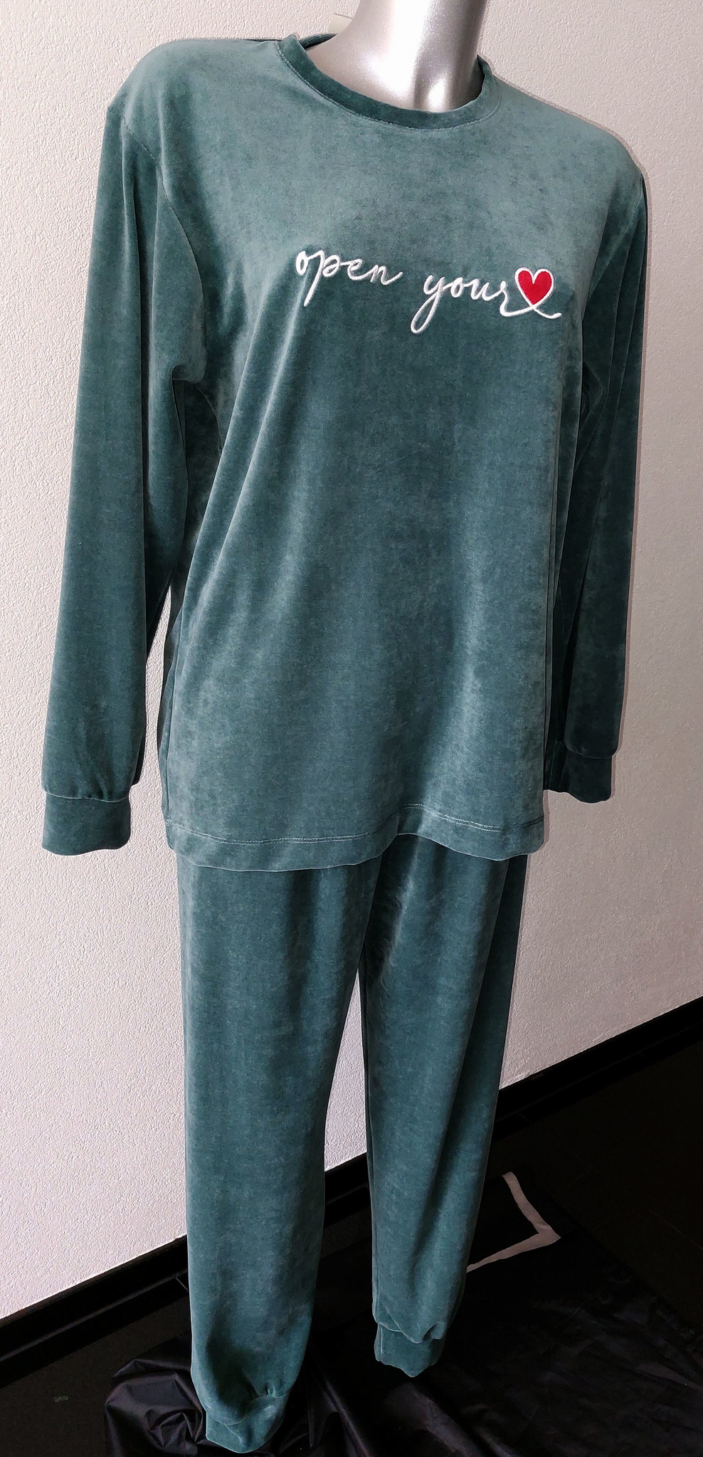 Lunatex Dila dames velours pyjama/huispak, in de kleur groen met op voorzijde jasje de tekst "Open Your Hart", de maat M.