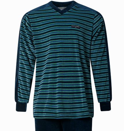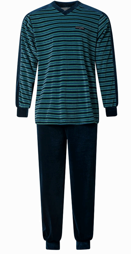 De Liyam herenpyjama uit de Gentlemen‑collectie is gemaakt van zachte velours en biedt direct warmte en comfort. Het petrol groene jasje heeft een stijlvolle streepprint in navy en lichtgroen en een klassieke V‑hals voor een rustige, elegante uitstraling.