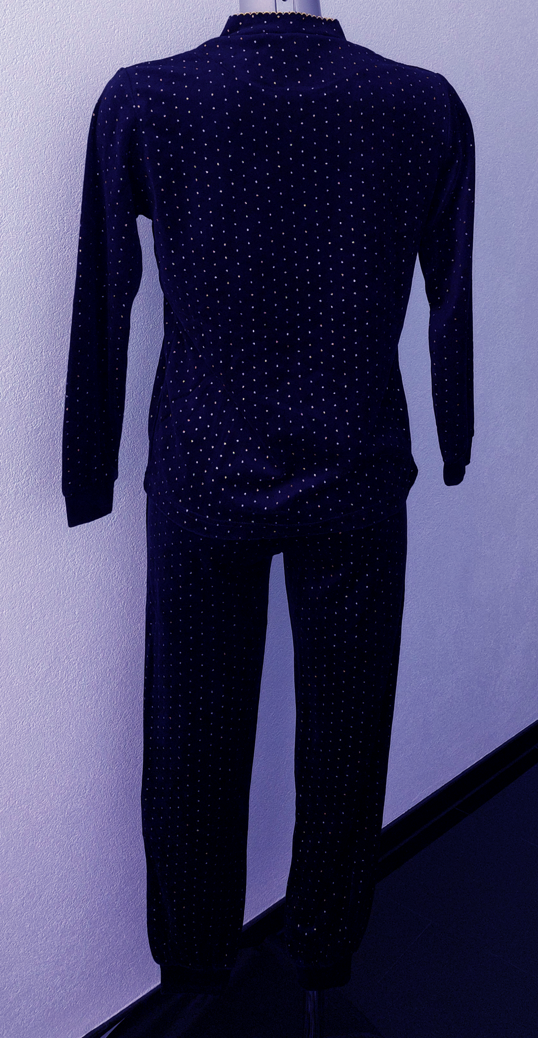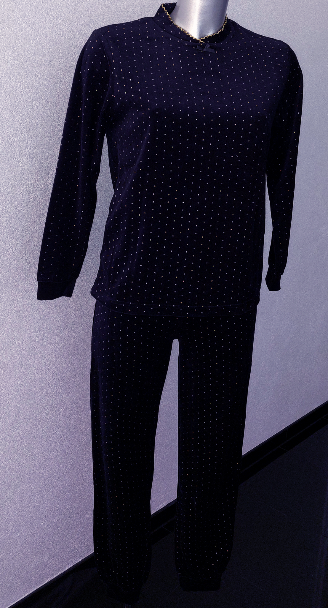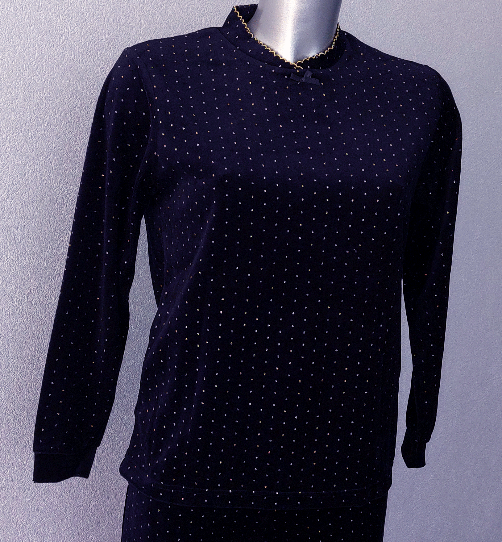 Uit de Lunatex collectie de velours meisjes pyjama Feline. Het jasje aan mouwen, voor & achterkant in uni kleur zwart met klein goudkleurig stipprintje in de stof meegeweven. de mt 152.
