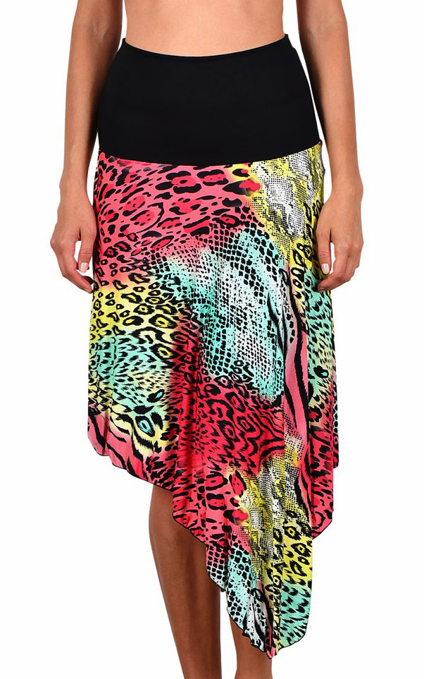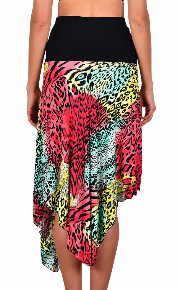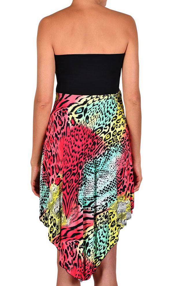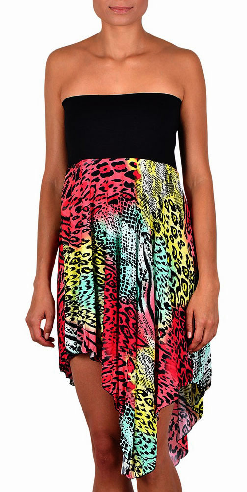 Uit de collectie van Naturana- Cybele een zomers (strand) jurkje dat ook als rok gedragen kan worden kleur zwart gecombineerd met mooie kleurrijke animal print. De maat 40/42.