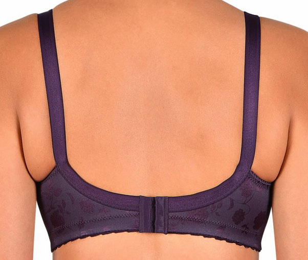 Naturana Lydia microfaser minimizer Bh zonder beugel. De mode kleur aubergine met in stof ingeweven print bloem.Leverbaar in de maten B85 of mt C100.
