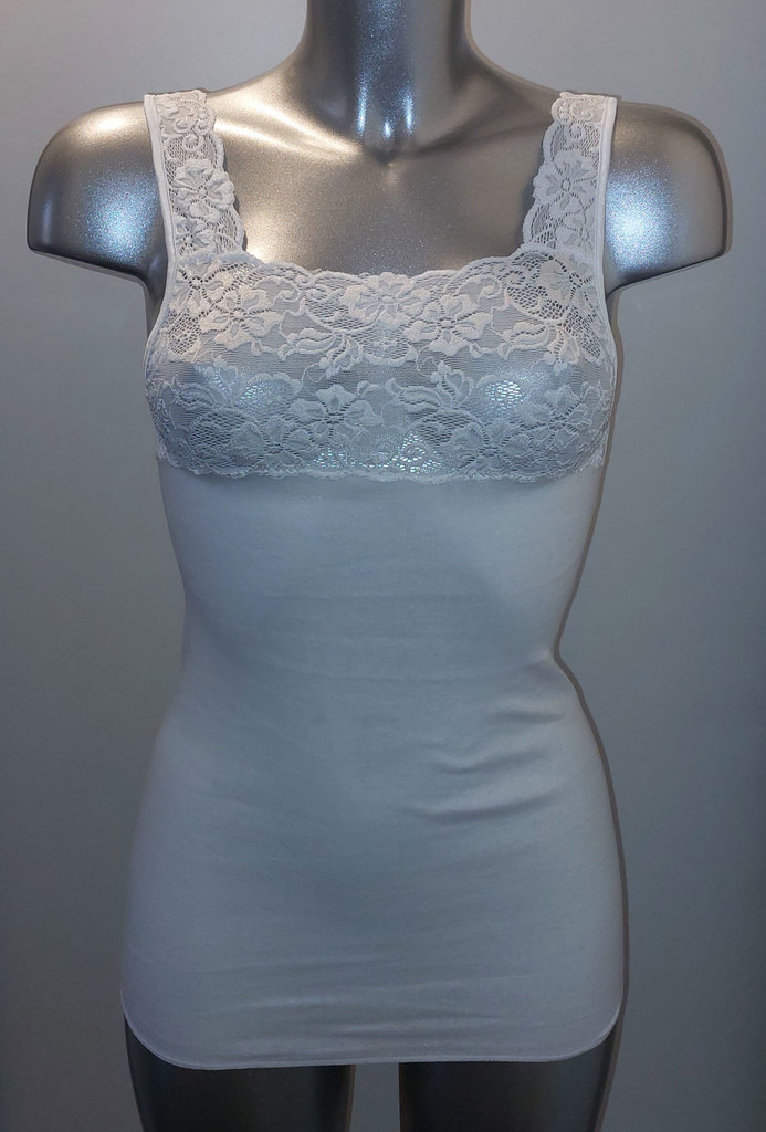 Nina von C Jessy is een mooie hooggesloten katoenen top in wit met verfijnd elastisch kant aan de bovenzijde en schouderbandjes. Leverbaar in maten 38–50. Bij Bodyfashion Born ontvangt u €5 korting vanaf €39,95 en €15 vanaf €99,95.