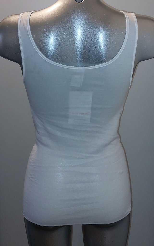 De Nina von C Jessy top in wit, verkrijgbaar in de maten 38 t/m 50, is een lichte en zachte katoenen damestop die mooi aansluit en een frisse, elegante uitstraling heeft. De hoogsluitende halslijn voelt prettig en geeft net dat beetje extra bedekking waar veel dames zich fijn bij voelen.
