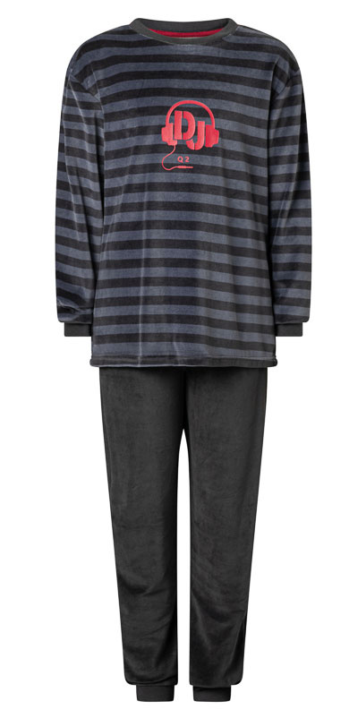 Lunatex Outfitter Manu velours jongenspyjama u heeft de keuze uit een jasje met grijze streepprint & broek in uni kleur grijs mt 128 t/m 152 of navy gestreept jasje met broek uni kleur navy, de maten 128 t/m 152.