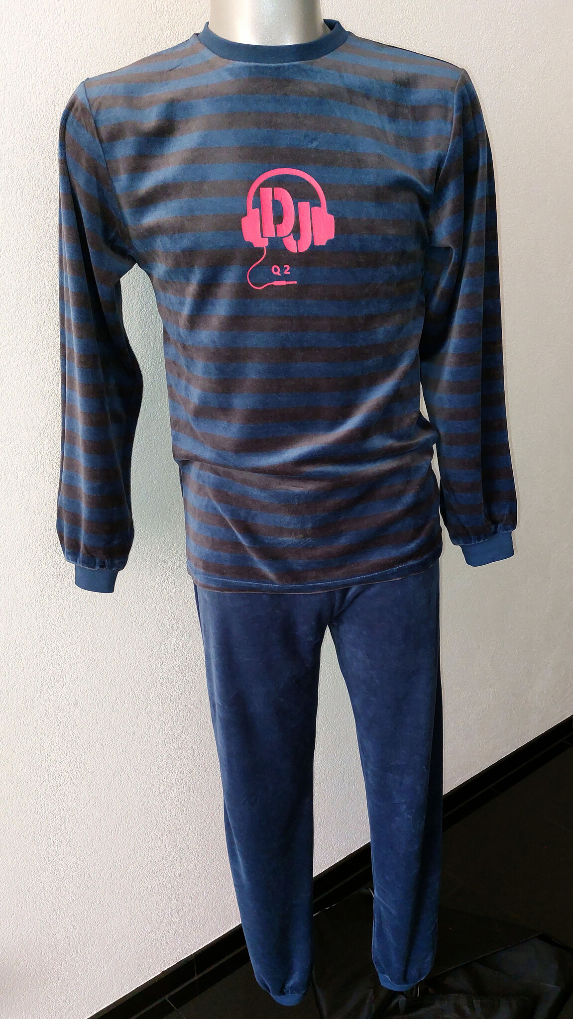 - Hals & boorden gemaakt van tricotstof kleur navy.