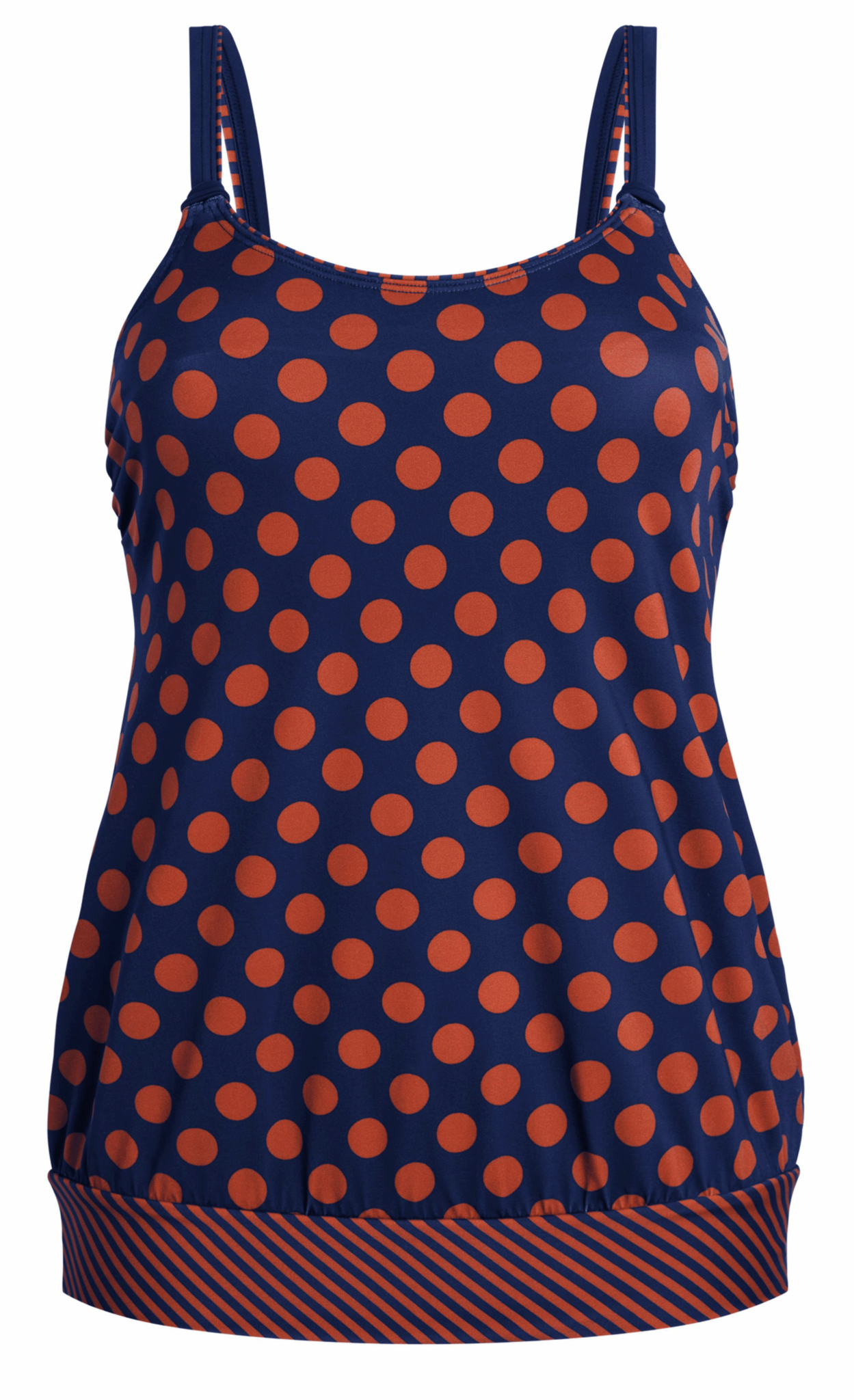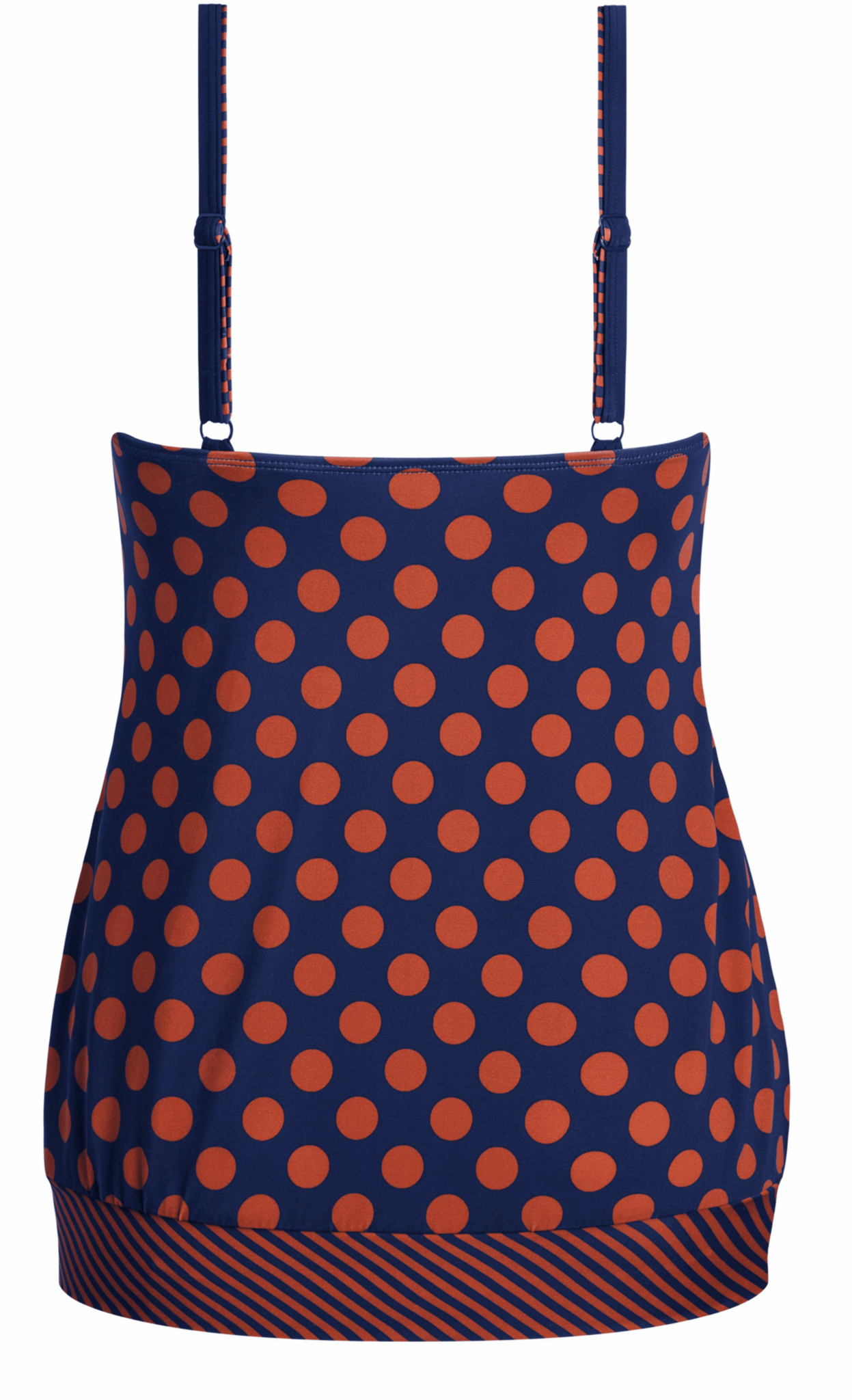 Amoena Alabama prothese tankinitop zonder beugel & licht voorgevormde cup in blouson model de maten B40/cupmt B80 t/m B44 is cupmt B90 & mt C38 is cupmt C75, mt C40 is cupmt C80 of mt C42/C85, kleur marineblauw met dots kleur brique.