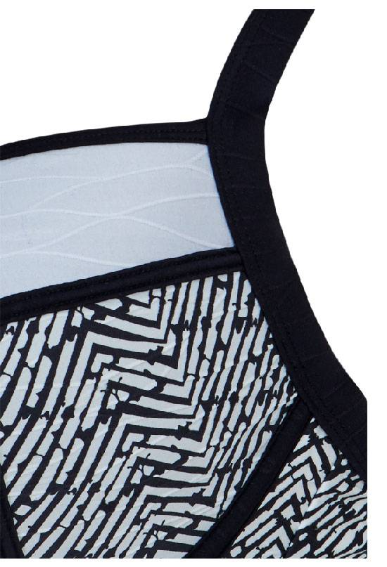 - Bikinitop in drie vlaks verdeling aan zijkant van de cup de kleur zwart met print wit, onderkant midden kleur zwart & de bovenrand kleur wit (stof in krinkle look).