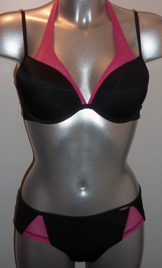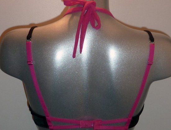 Uit de Sale collectie van Sapph de Envy Bh met beugel & licht voorgevormde cup in hoofdkleur zwart met pinkkleurige neckholder die u in uw nek kunt vastmaken of achter gelijk met de schouderbandjes kunt laten lopen. Nog leverbaar in de maat A80.