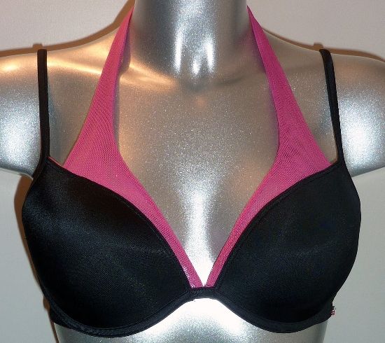 Uit Sale collectie van Sapph de Envy Bh met beugel & licht voorgevormde cup hoofdkleur zwart met pinkkleurige neckholder die u in uw nek kunt vastmaken of achter gelijk met schouderbandjes kunt laten lopen. Leverbaar in de maat A80.