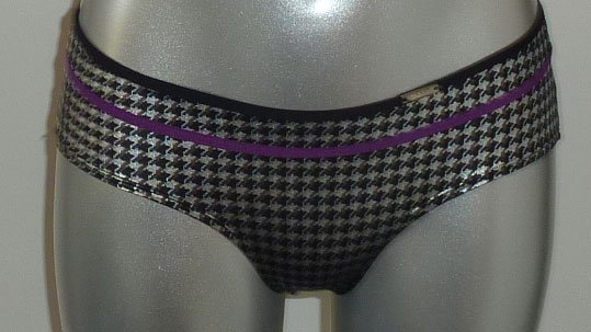 Uit de Sapph Sale collectie de Isis heupboxershort in modieuze Piede de Poule print met contrastbies in de kleur purple. Nog leverbaar in de maat S.