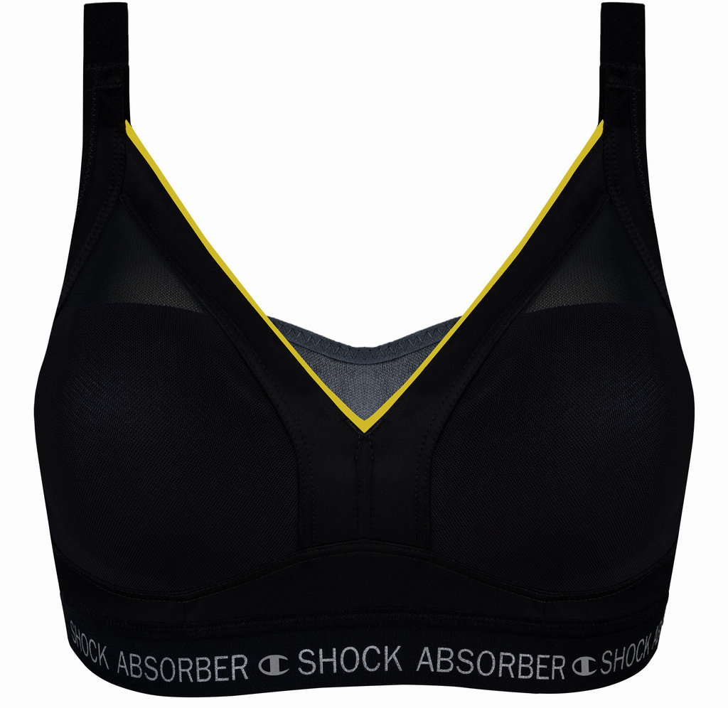 Uit de Shock Absorber collectie de Active Shaped Support Sport-bh zonder beugel & vaste padding. In High Support Level. Leverbaar in de maten C75 t/m G75.De kleurencombinatie zwart met padding in kleur grijs & gele contrast bies.