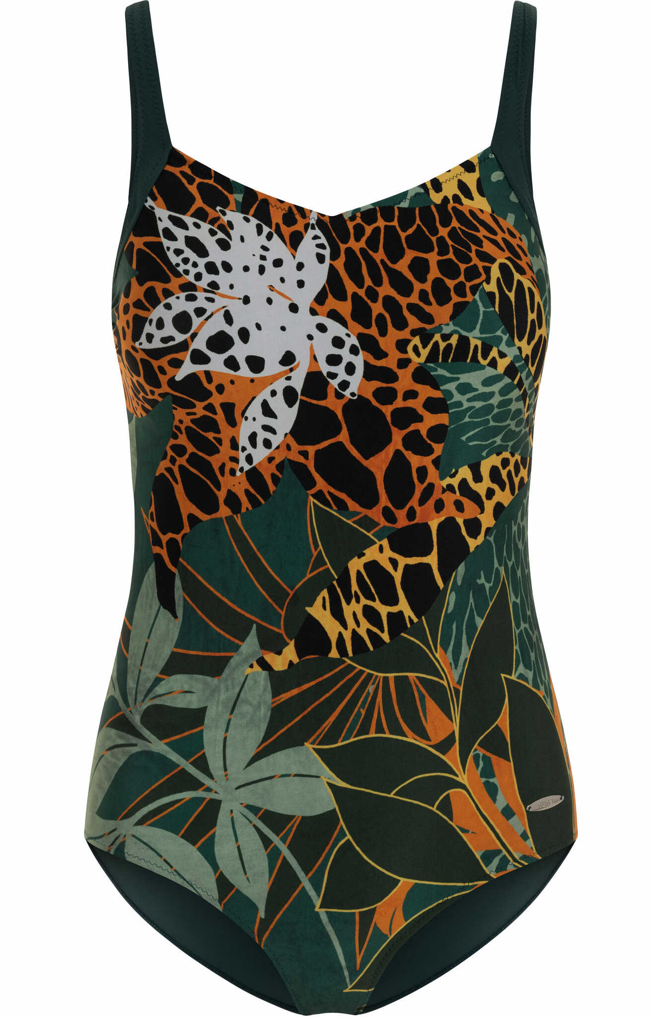 Uit de Susa Care badmode collectie het Jungle Vibes prothese badpak, zonder beugel & licht voorgevormde cups, de mt B48=cupmt B100, mt C44=cupmt C90, badpak aan voorzijde voorzien van print, de achterzijde uni kleur groen.