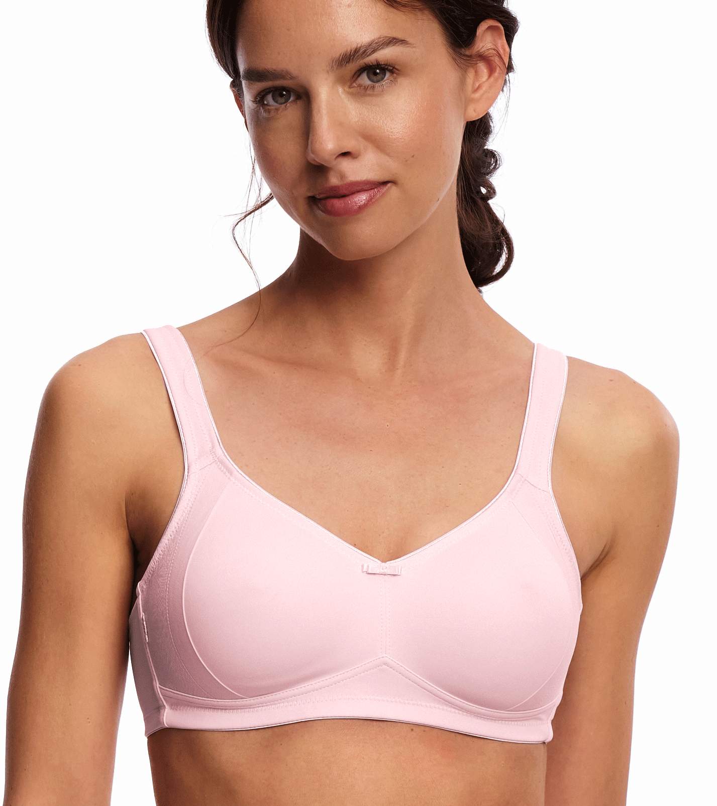 De brede onderband zorgt dat de bh netjes blijft zitten bij elke beweging. Het hoog sluitende achterpand geeft extra stevigheid en kleedt mooi af onder kleding. De brede, achter verstelbare comfortbandjes zijn ter hoogte van de schouders voorzien van luchtkussentjes, waardoor de druk op de schouders wordt verminderd.