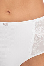 Susa Porto taille slip in lichtgewicht microfaser, voorpand licht corrigerend, met ingeweven structuur printje, zijpanden licht transparant met bloemen borduursel, achterpand glad, in basis kleur wit of sand, maten 38 t/m 52.