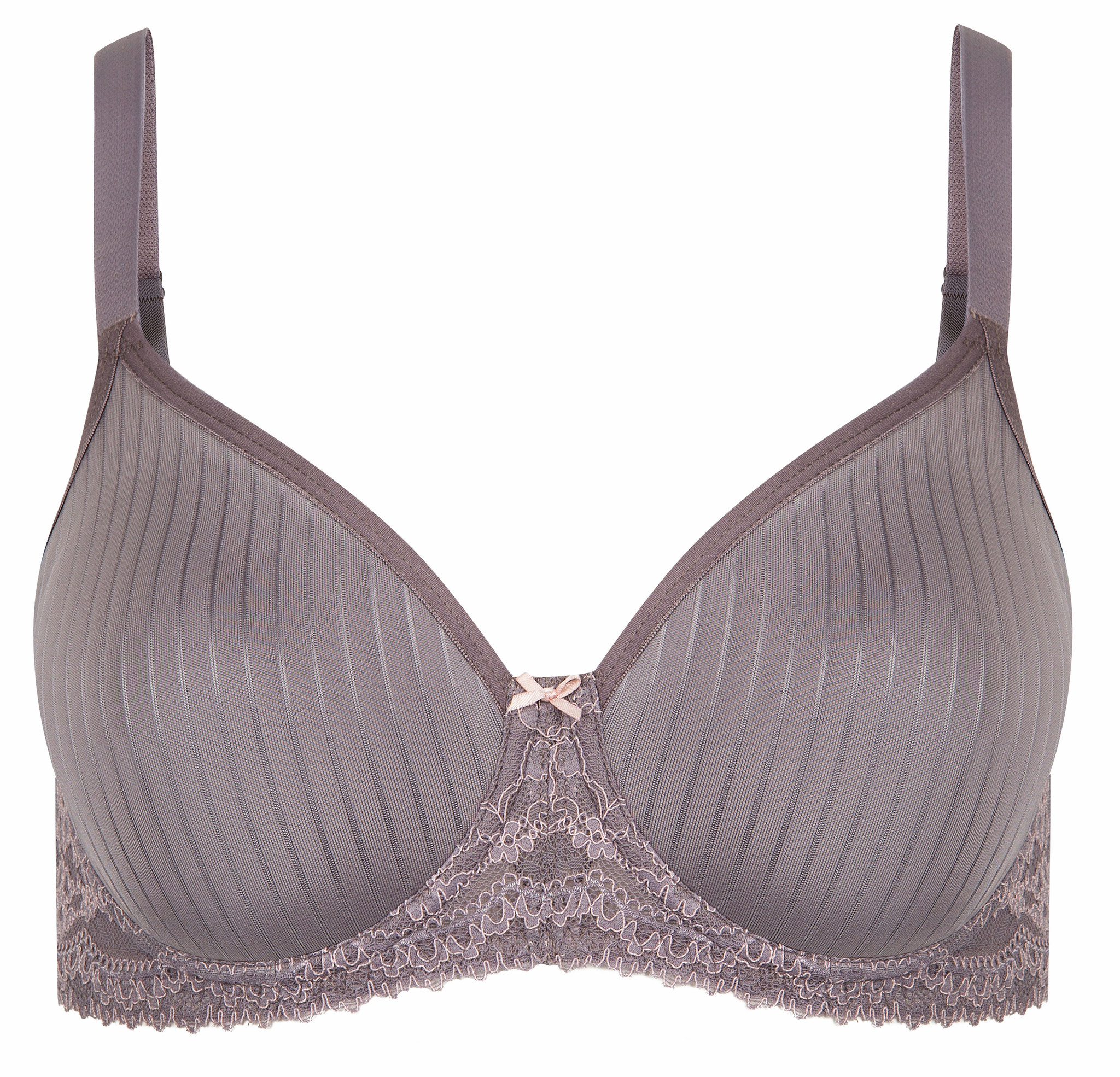 Uit de Susa collectie de Madeira Bh zonder beugel & gladde licht voorgevormde spacer cup.Leverbaar in de maat B90, mode kleur frosty lavender grijs,met ragfijn krijtstreep meegeweven in de stof.