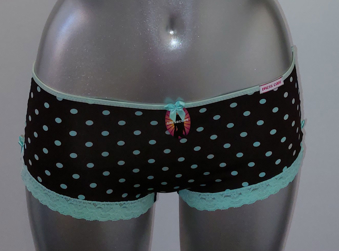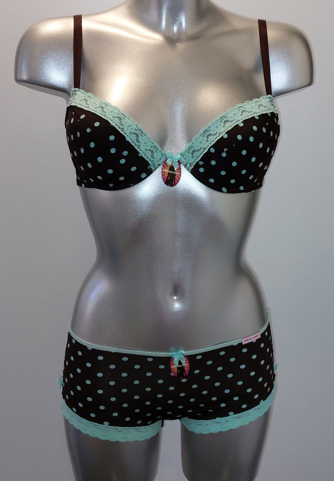 Uit de SALE collectie van Dresscode Junelle microfaser Bh zonder beugel,licht voorgevormd, mt B75, met bijpassende microfaser boxershort, de kleur bruin met print dots in kleur mintgroen de mt 176.