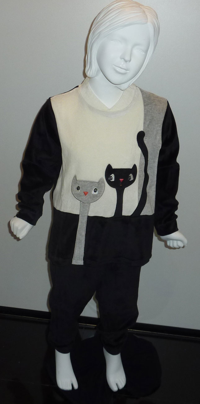 - Jasje met V-hals & elastische boordjes aan de mouwtjes & leuke applicatie (ook gemaakt van velours) van twee poezen in kleur grijs & zwart.