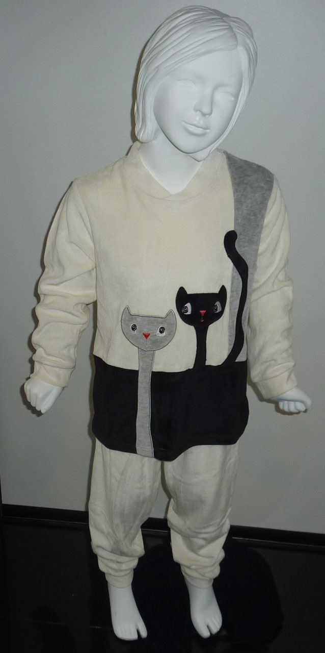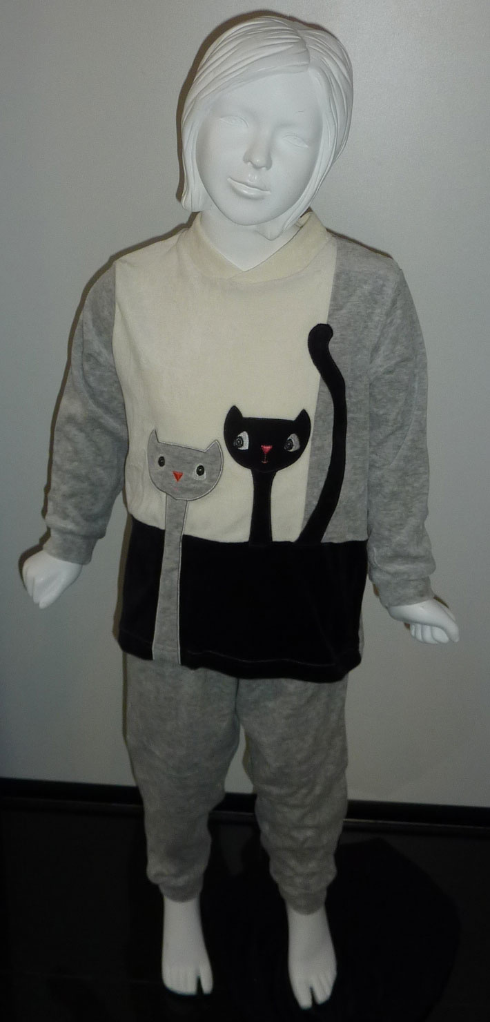 Uit de Lunatex collectie schattige zachte velourspyjama Leeza met een poezen applicatie . Leverbaar in grijs mt 116 & zwart mt 110 & 116, ivoor kleur in de maten 110 t/m 128.