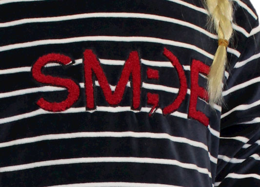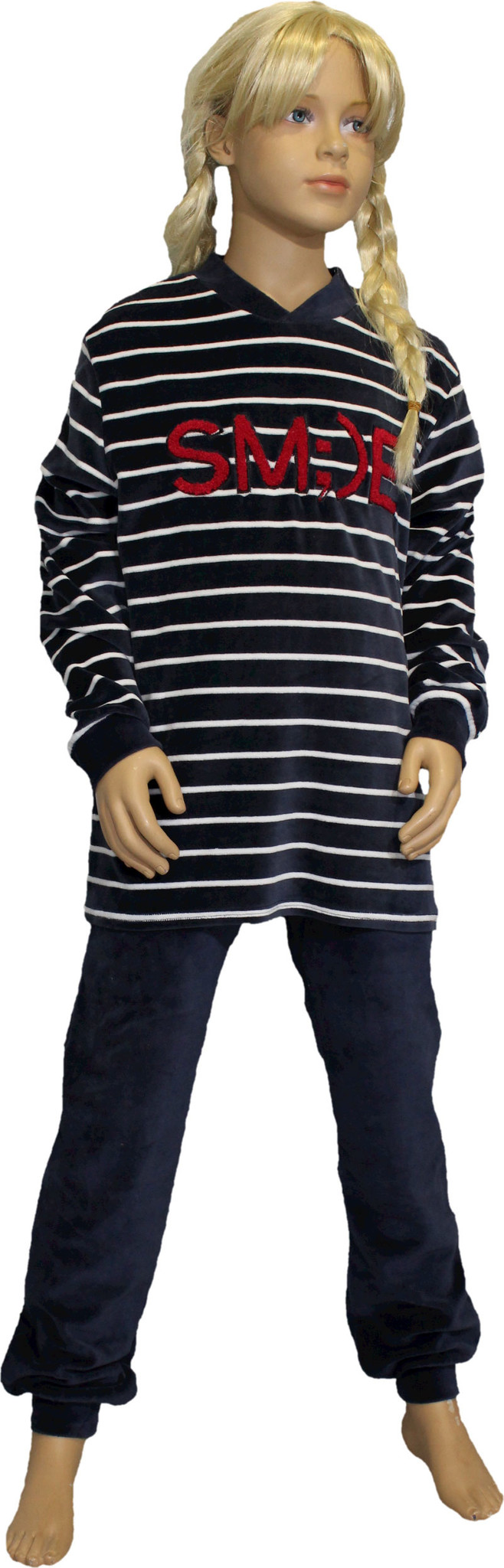 Uit de Lunatex collectie de zachte velours meisjes pyjama Evi. Jasje kleur navy met witte streepprint en rode stoffen frotte letters "SMILE" de Broek uni kleur navy de maten 140 t/m 176.