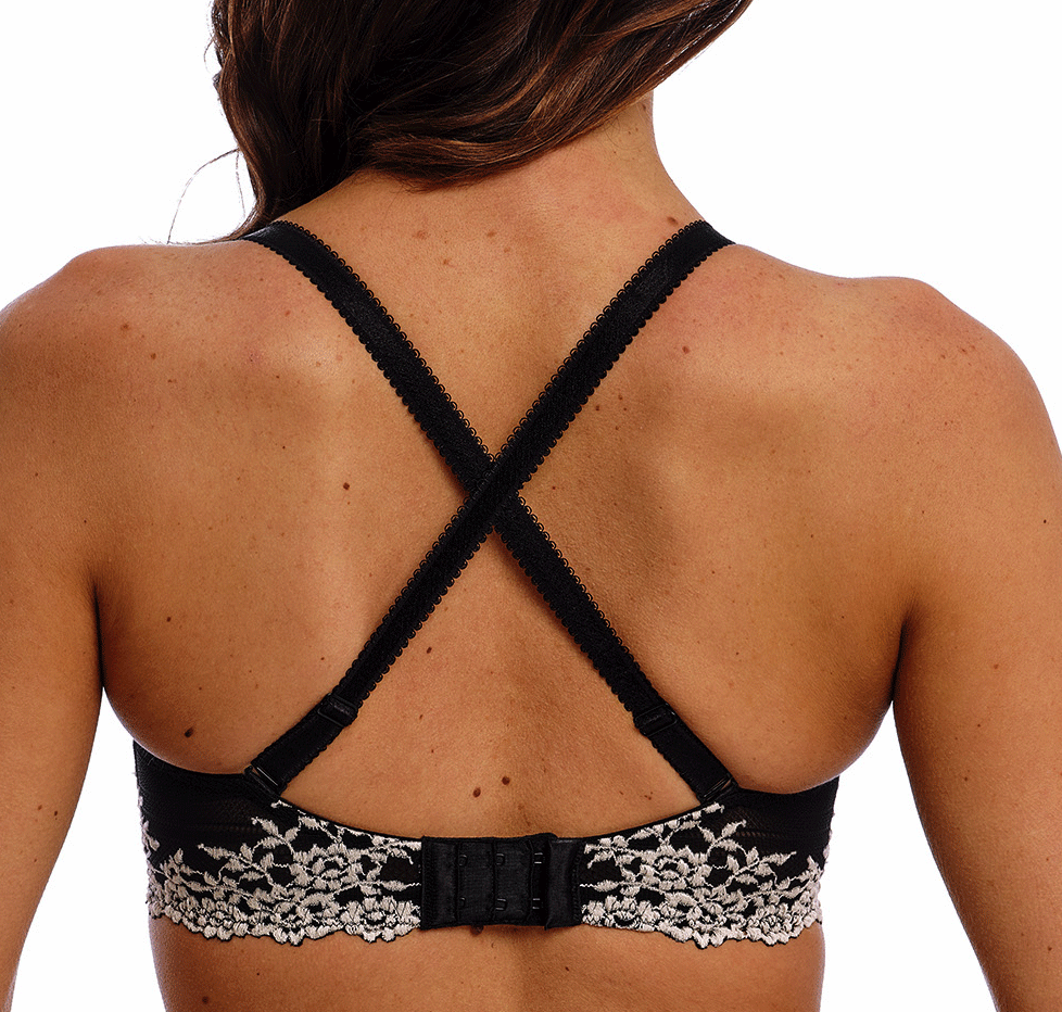 Wacoal Embrace Lace Plunge Bh met beugel & licht voorgevormde cup & multiway schouderbandjes in triangle model. De basis kleur zwart gecombineerd met ecru kleurig borduursel in bloemenprint. De maten B75 t/m F80.